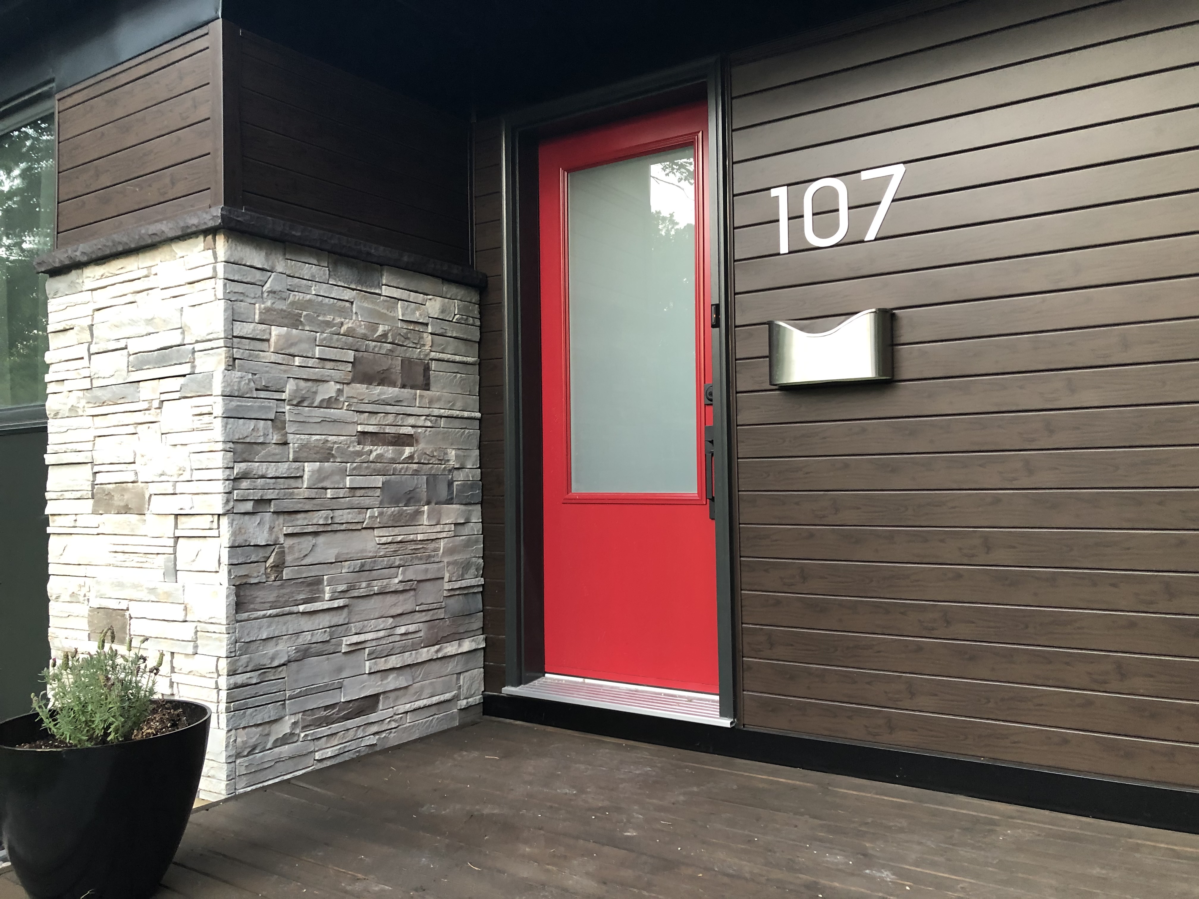 This project updated the exterior of a 1950’s bungalow in Old Tuxedo to be more contemporary, energy efficient and accessible. The entire exterior including existing stucco, concrete step, windows, fascia and eavestrough were replaced with new insulation, fiberglass windows, cladding and deck. The cement board panels, siding and cultured stone façade creates a modern and welcoming approach to the front of the house.