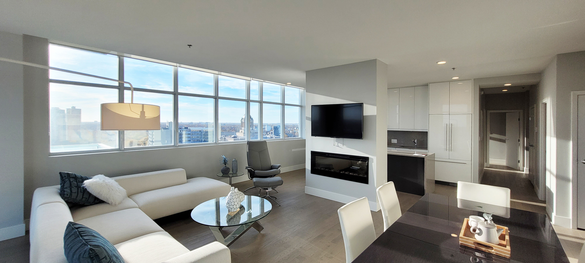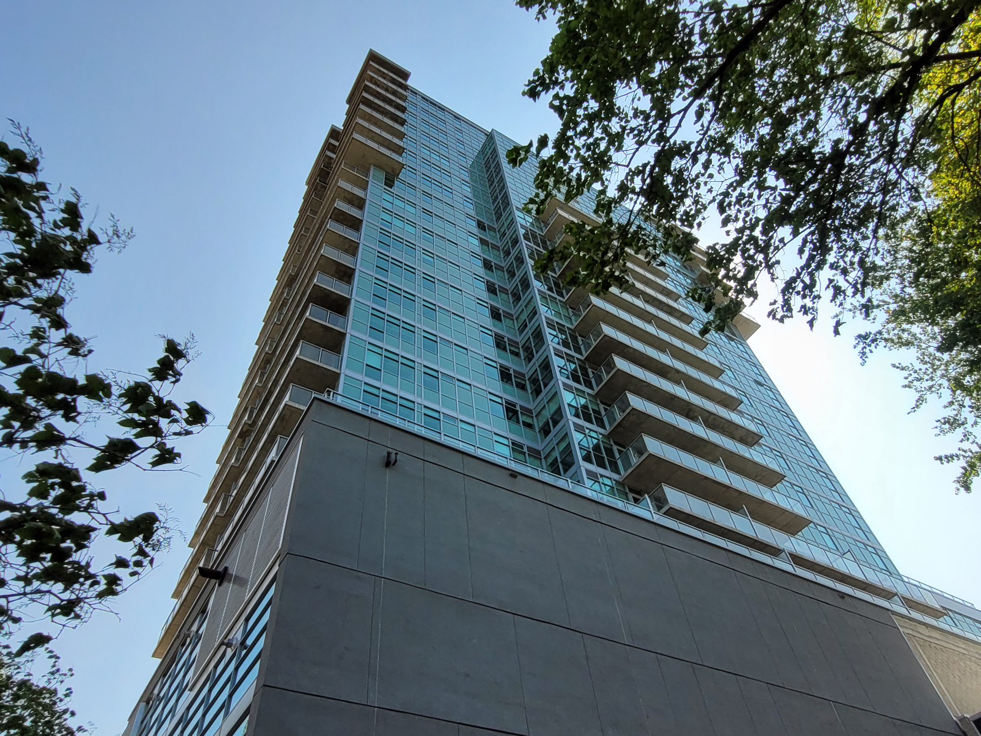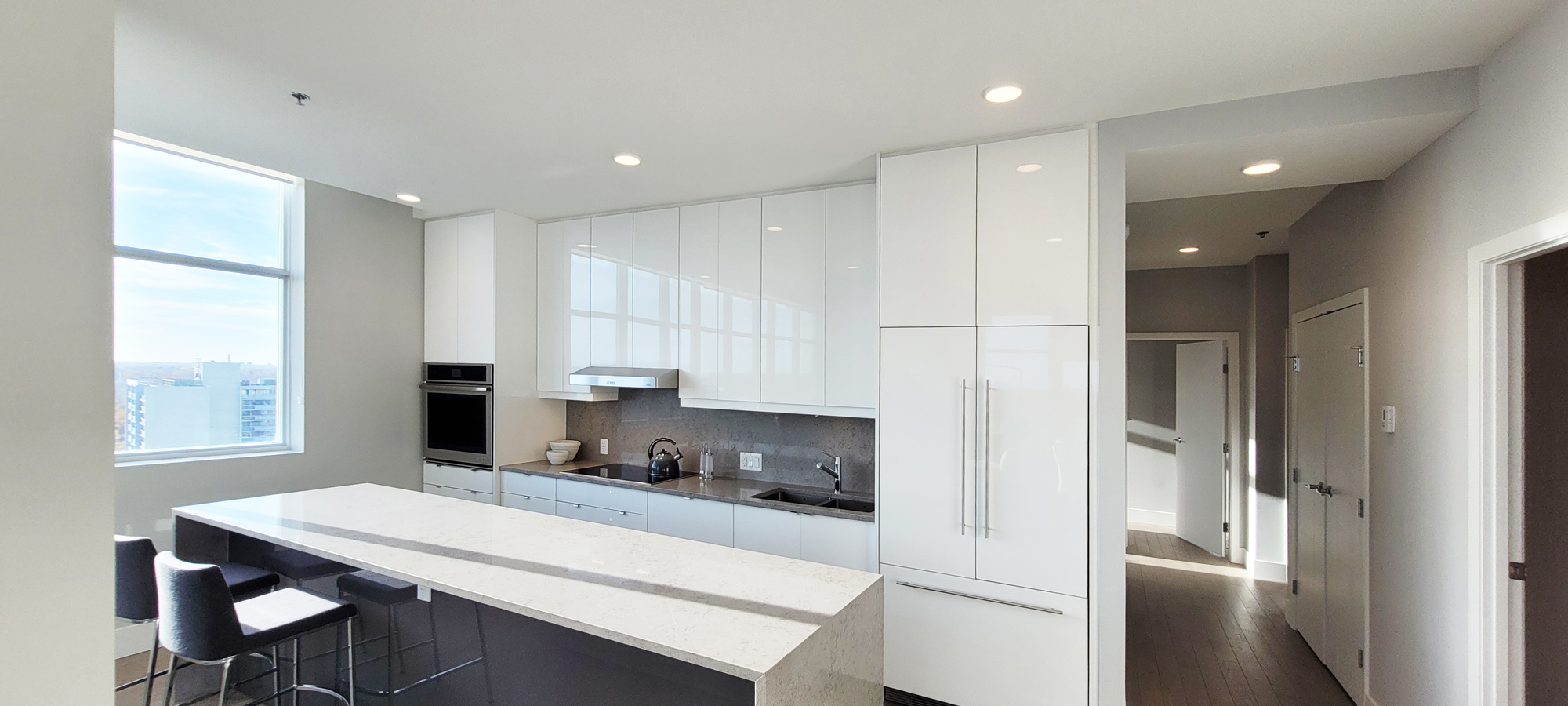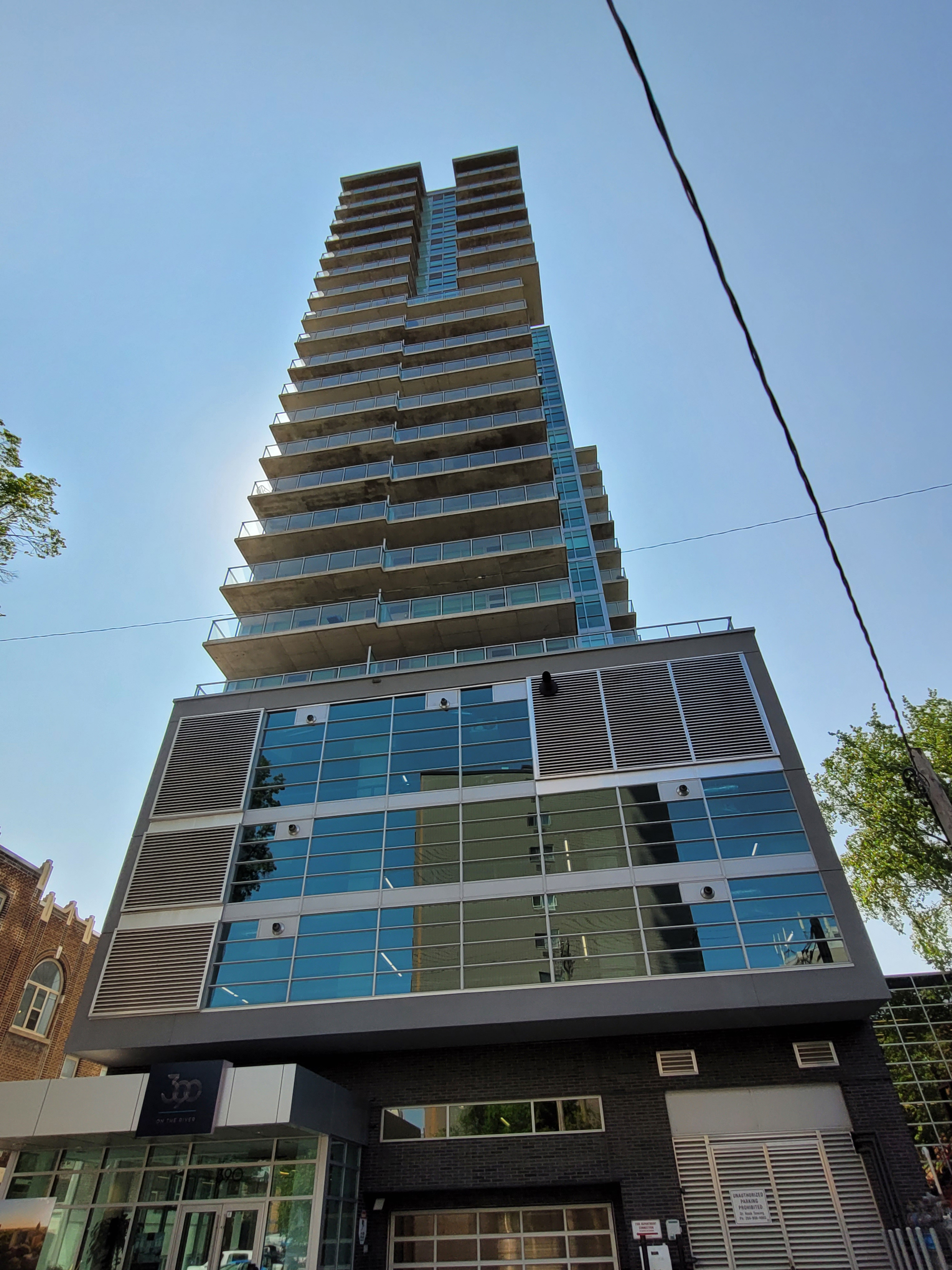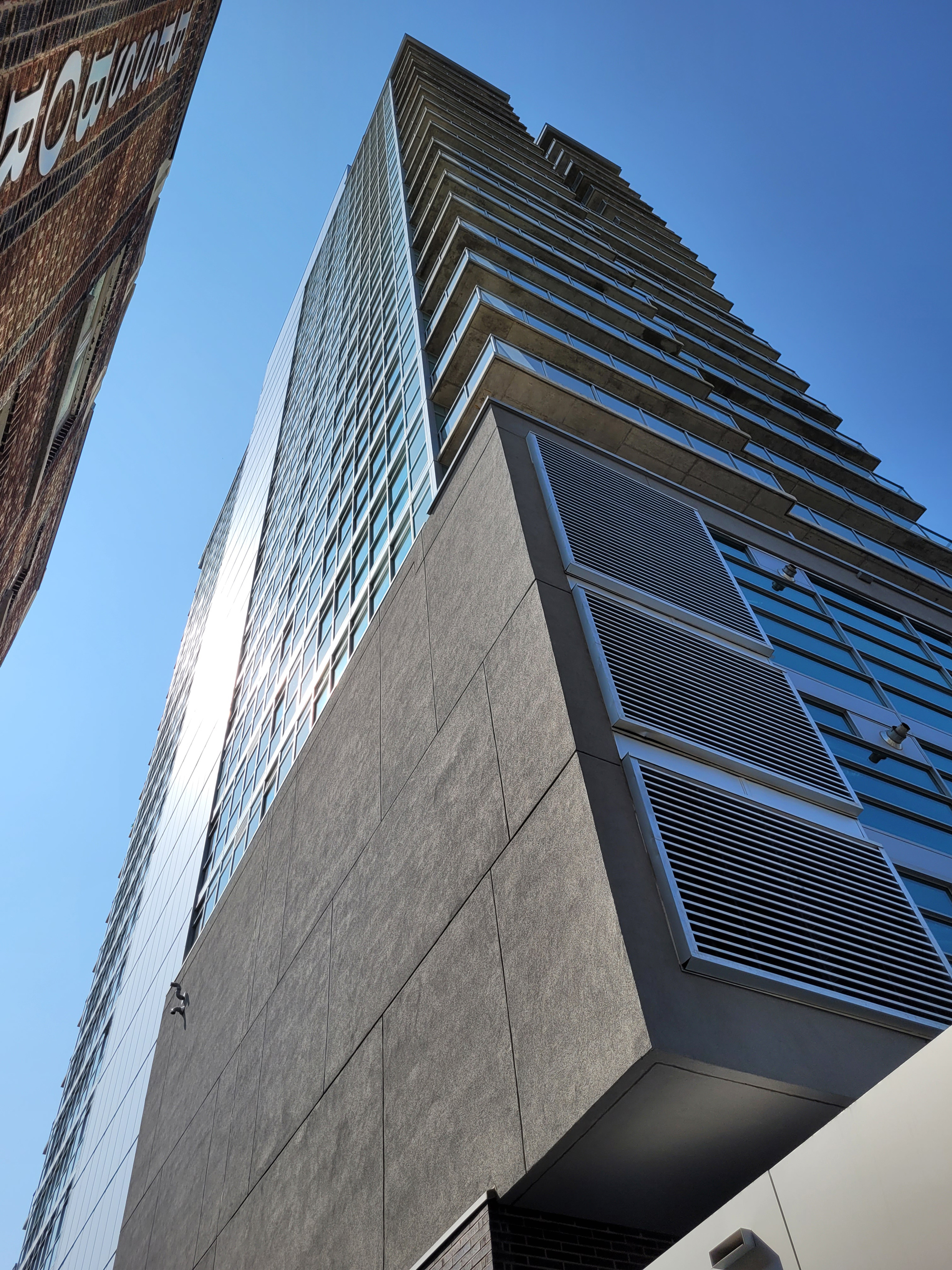The podium and tower structure is cast in place concrete with heated floors and embedded electrical infrastructure. Each residential floor contains between 4 and 6 units. Interiors are modern with Italian kitchens and sleek finishes. The larger units are located on floors 15-23 with penthouse units on the top floor.