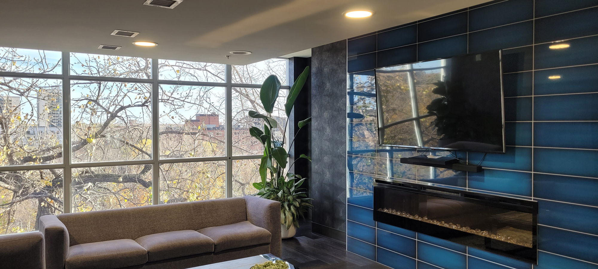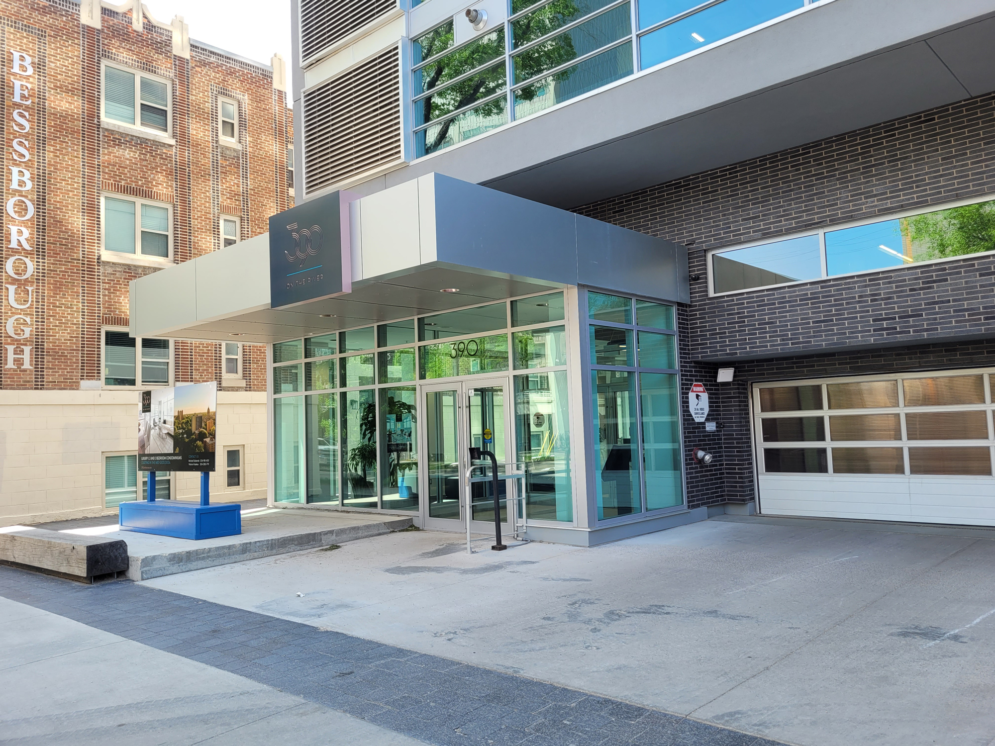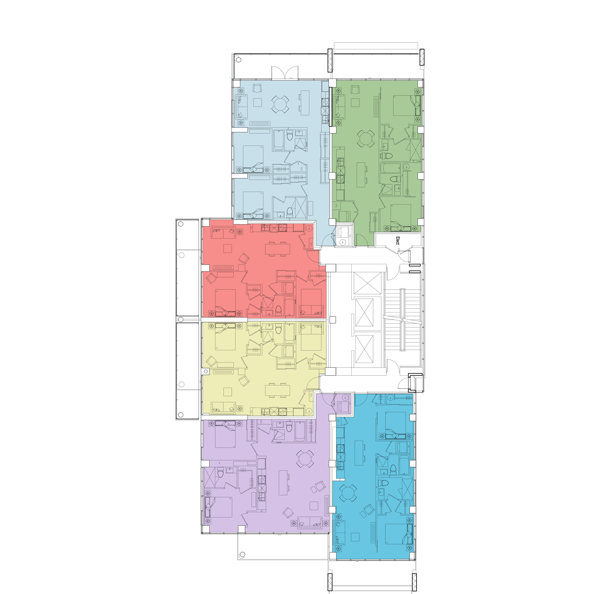The parking podium has full height glazing on the north and south walls and contains parking stalls, a car wash, and visitor parking.