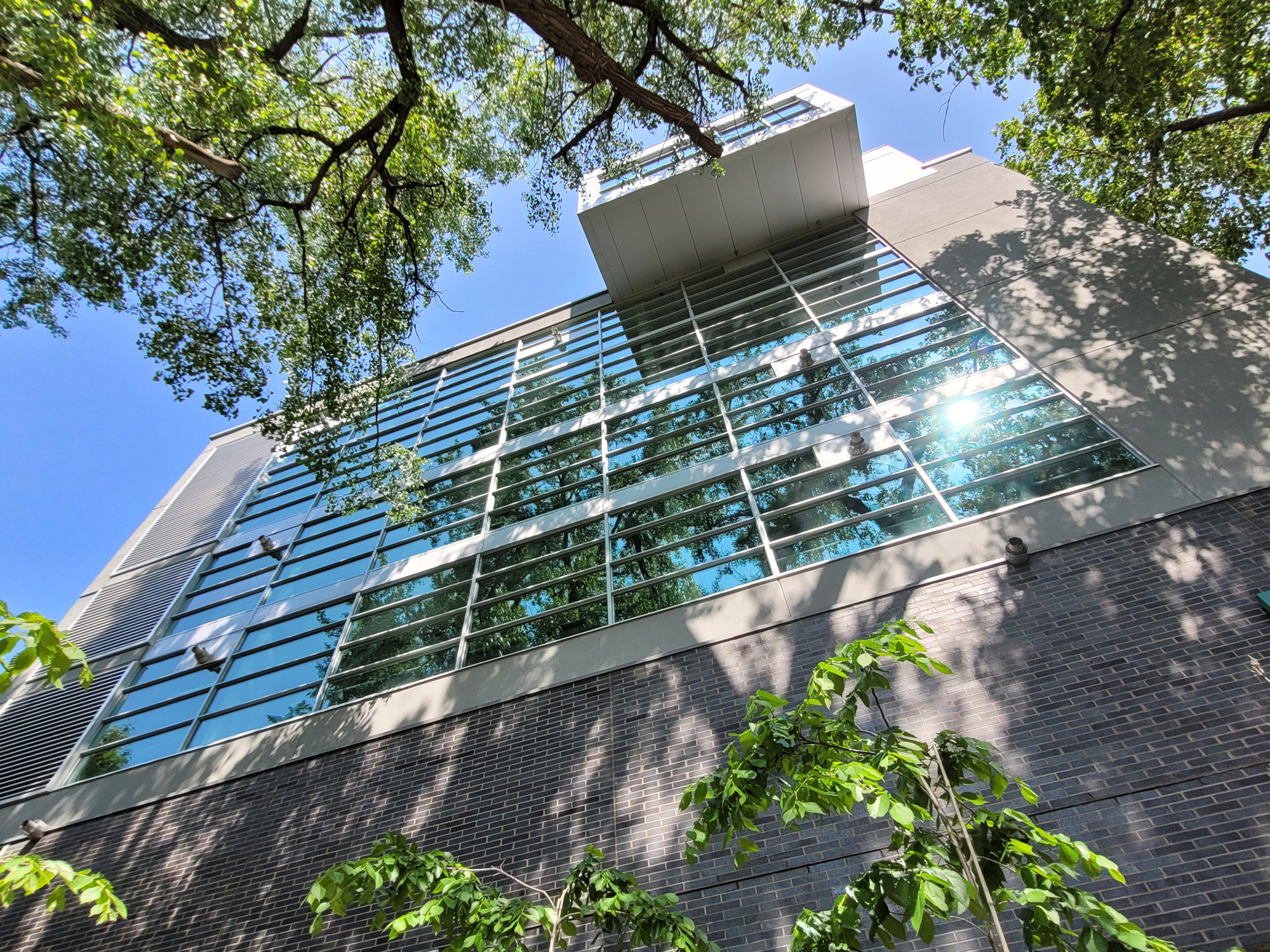 The Exterior envelope is entirely composed of window wall with insulated metal panel running vertically along the elevator core.
