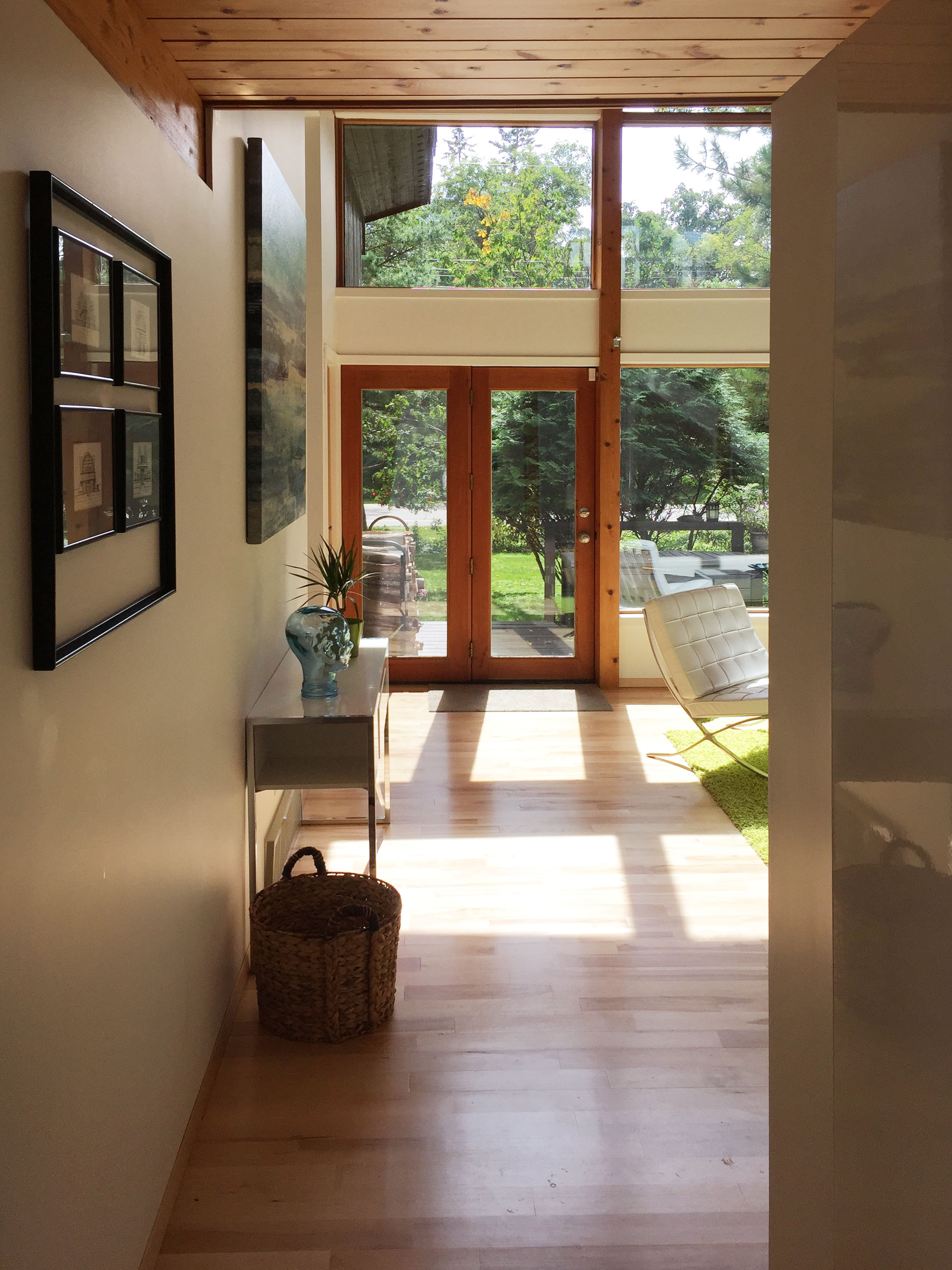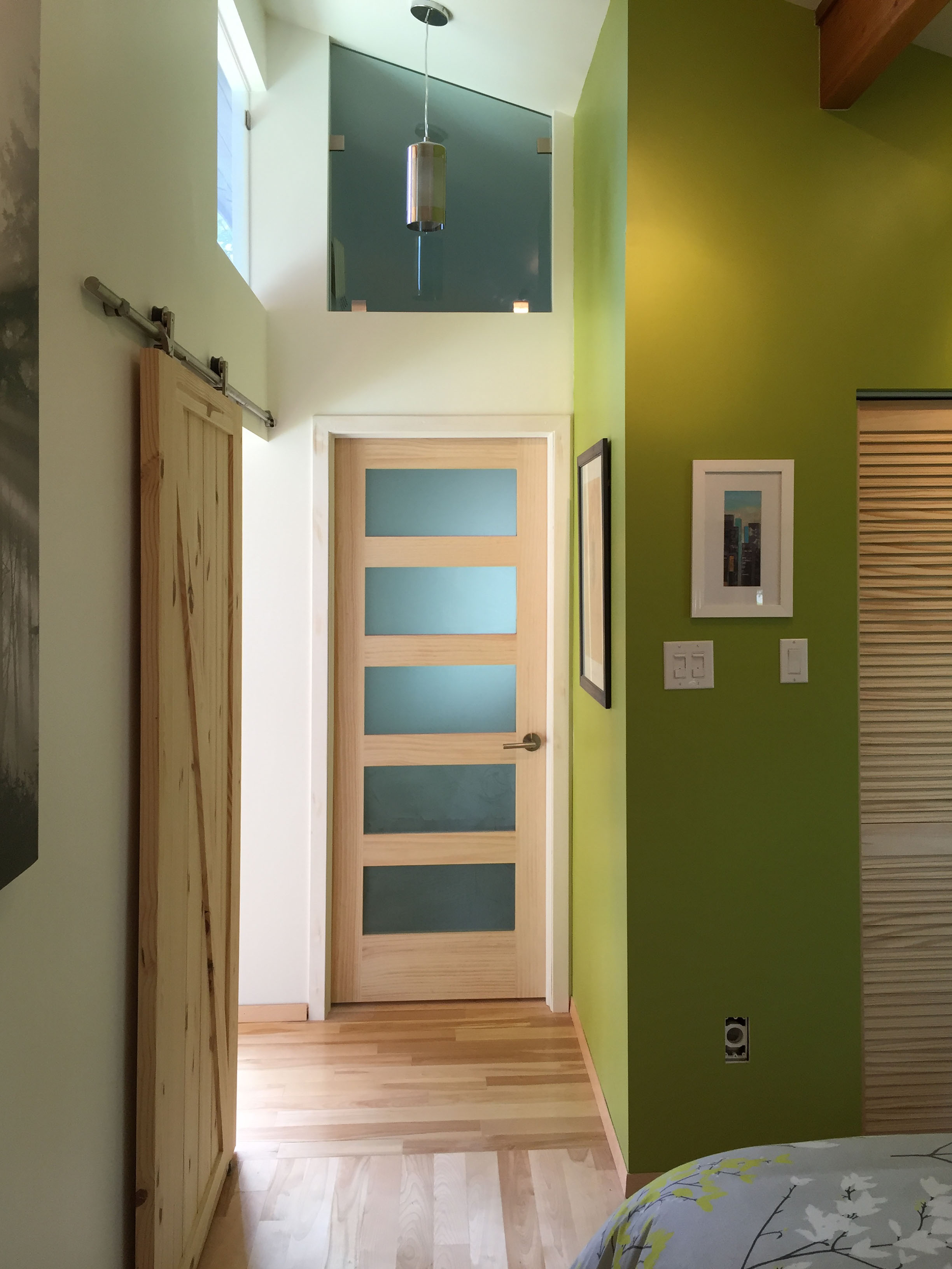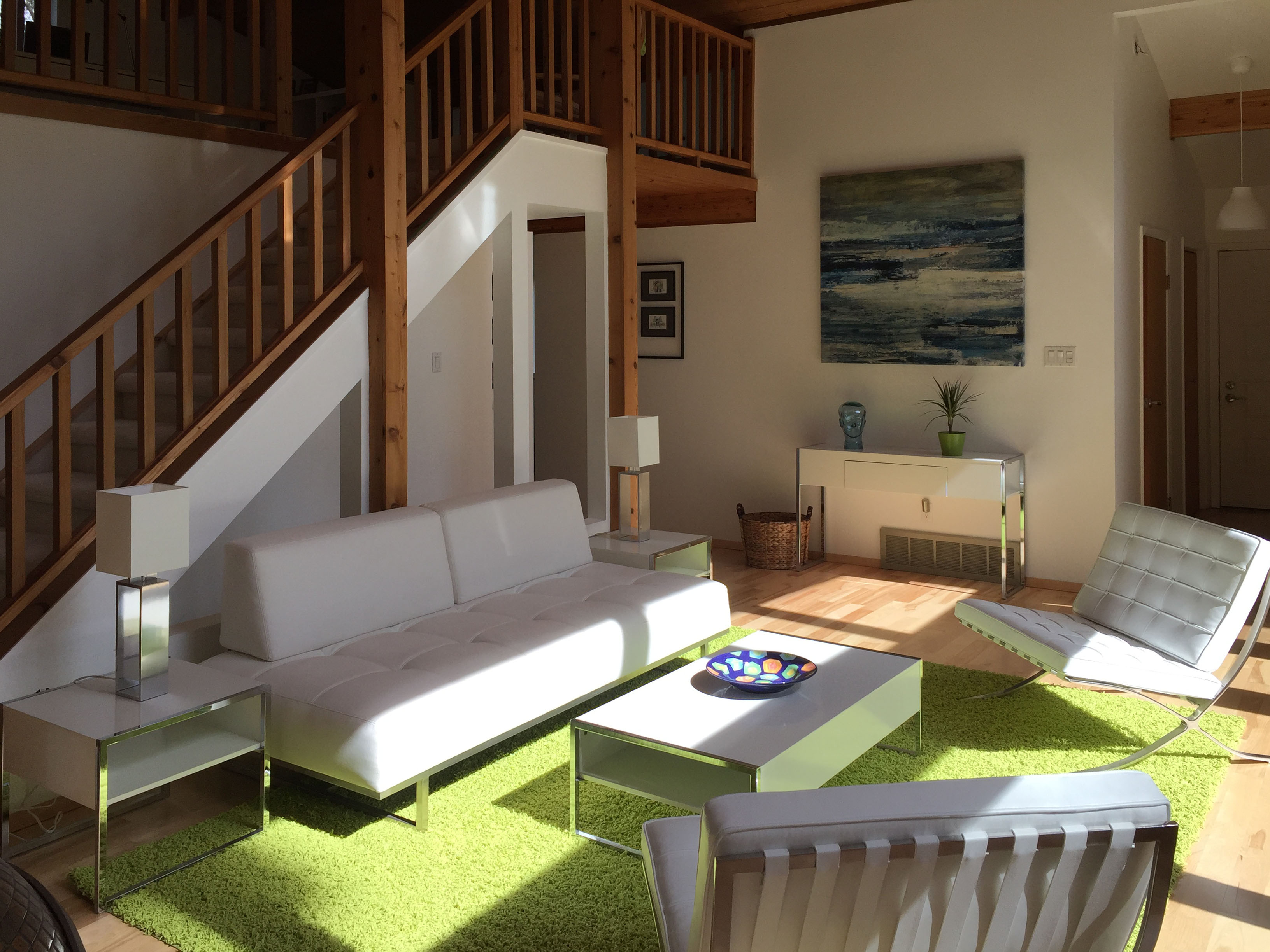 The house was completely repainted and some of the existing exposed wood finish was painted over in white. The bathroom was gutted and renovated with a new glass shower, stone vanity top, jet tub, and built in storage shelf. the existing master bedroom closet was expanded into a walk-in closet.