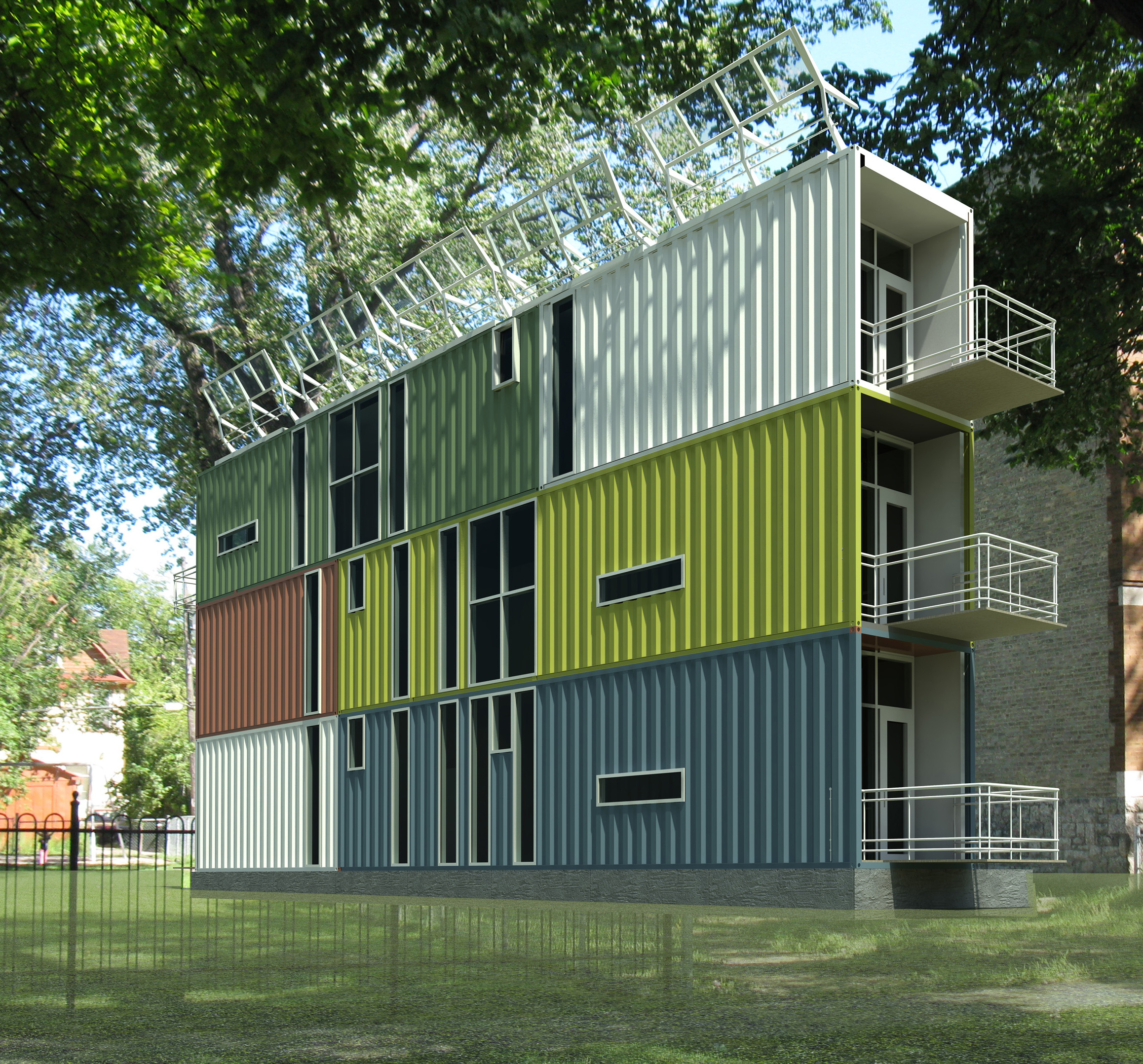 The study examined both the possibilities and constraints of employing shipping containers as housing units. Each level was conceived from one 40-foot and one 20-foot high-cube container, allowing the units to be stacked up to three storeys. Within this framework, the program could accommodate a compact kitchen and dining area, living space, as many as four bedrooms, and between three and five bathrooms.