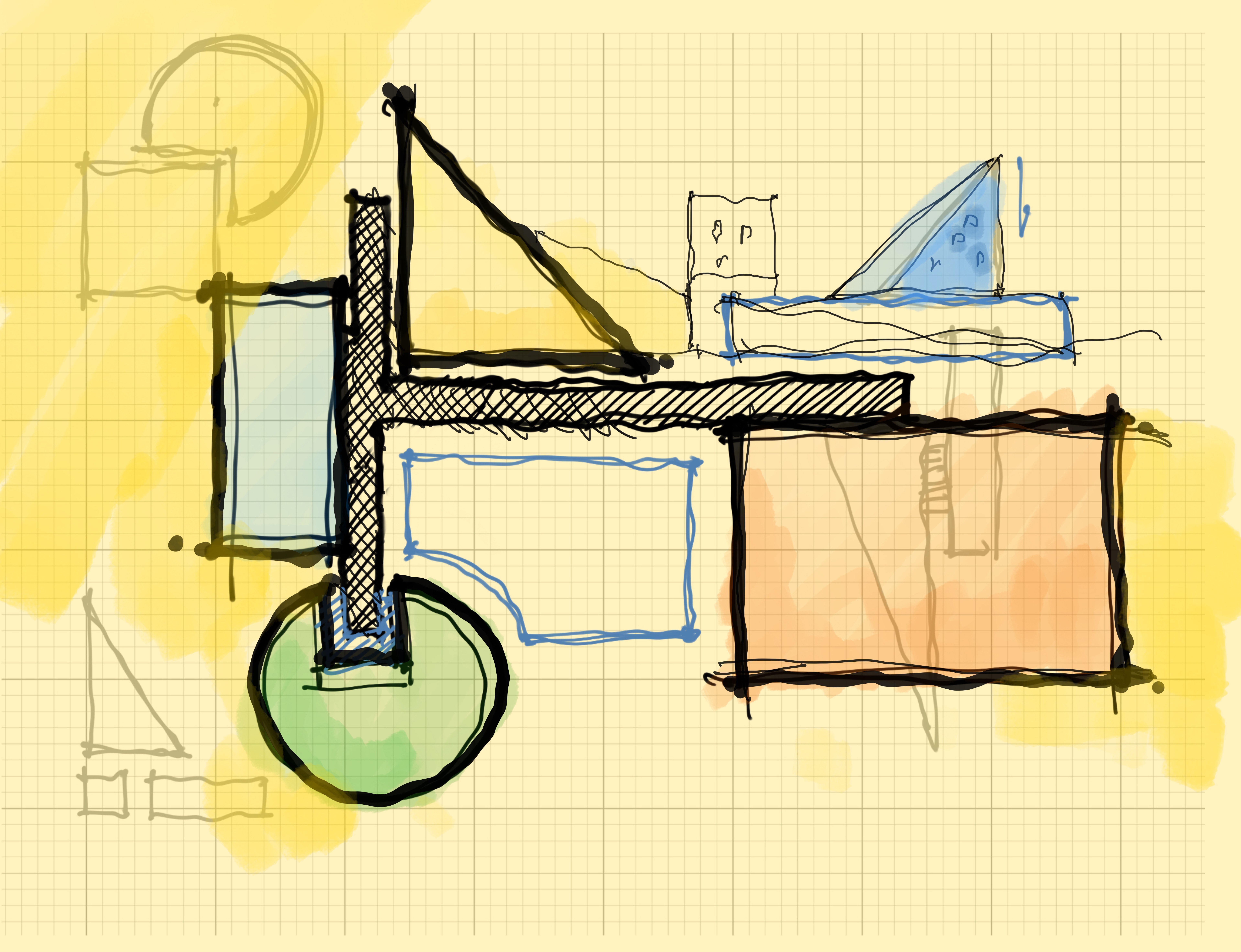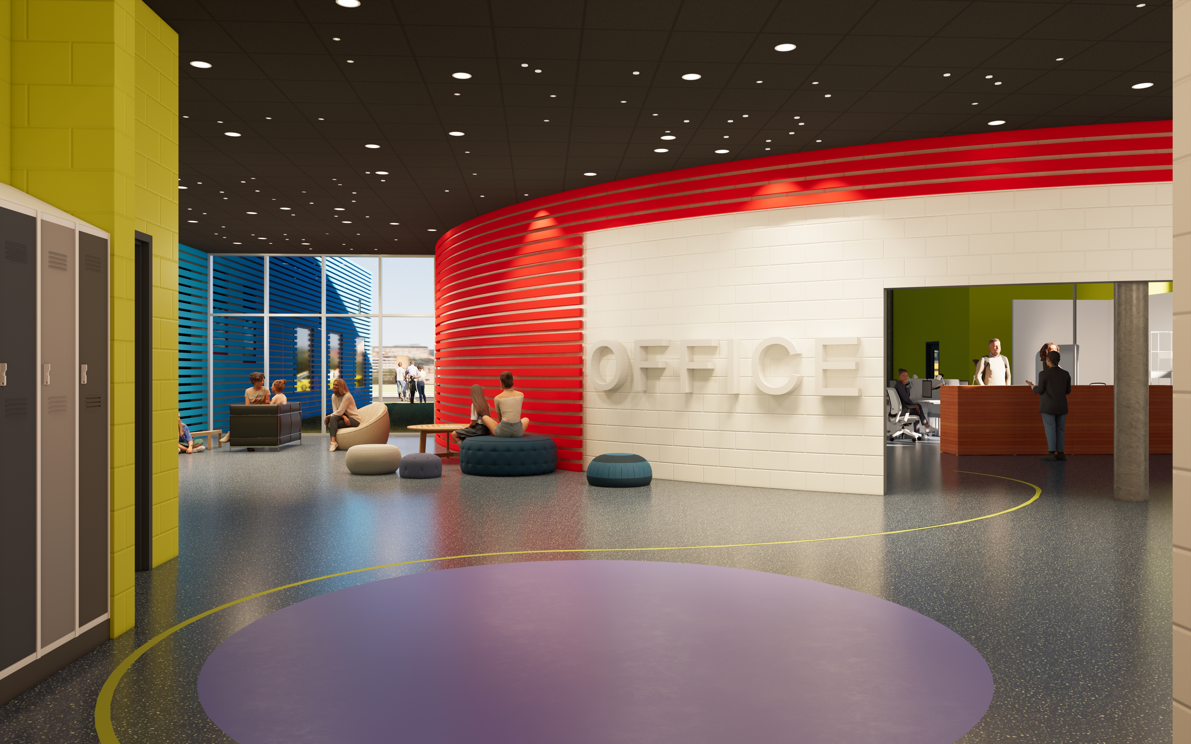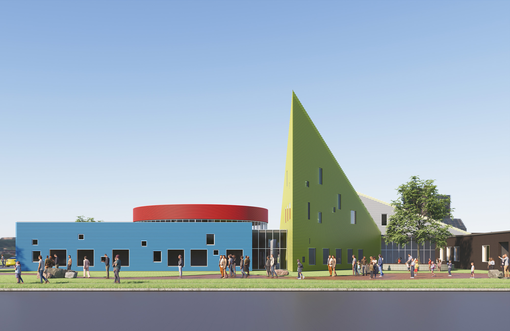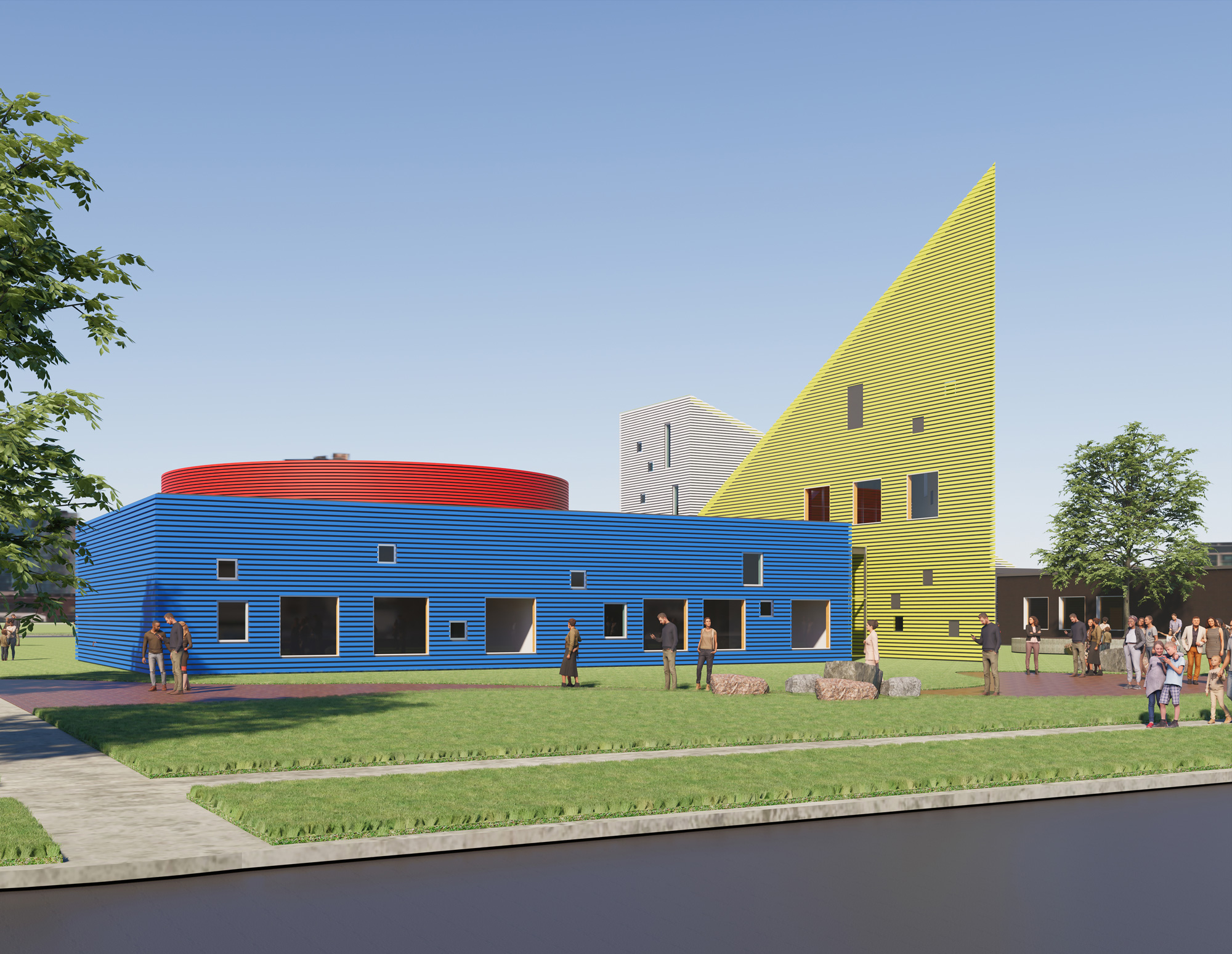 The program included five classrooms, an art room, a science room, offices, spaces for health and life skills, a gymnasium, and areas for outdoor study and collaboration. Each program element was given a distinct identity, expressed through form and colour. Primary geometric volumes—a blue cube, a red cylinder, a yellow prism—acted as legible icons, orienting students and reinforcing the idea that the building itself participates in teaching.