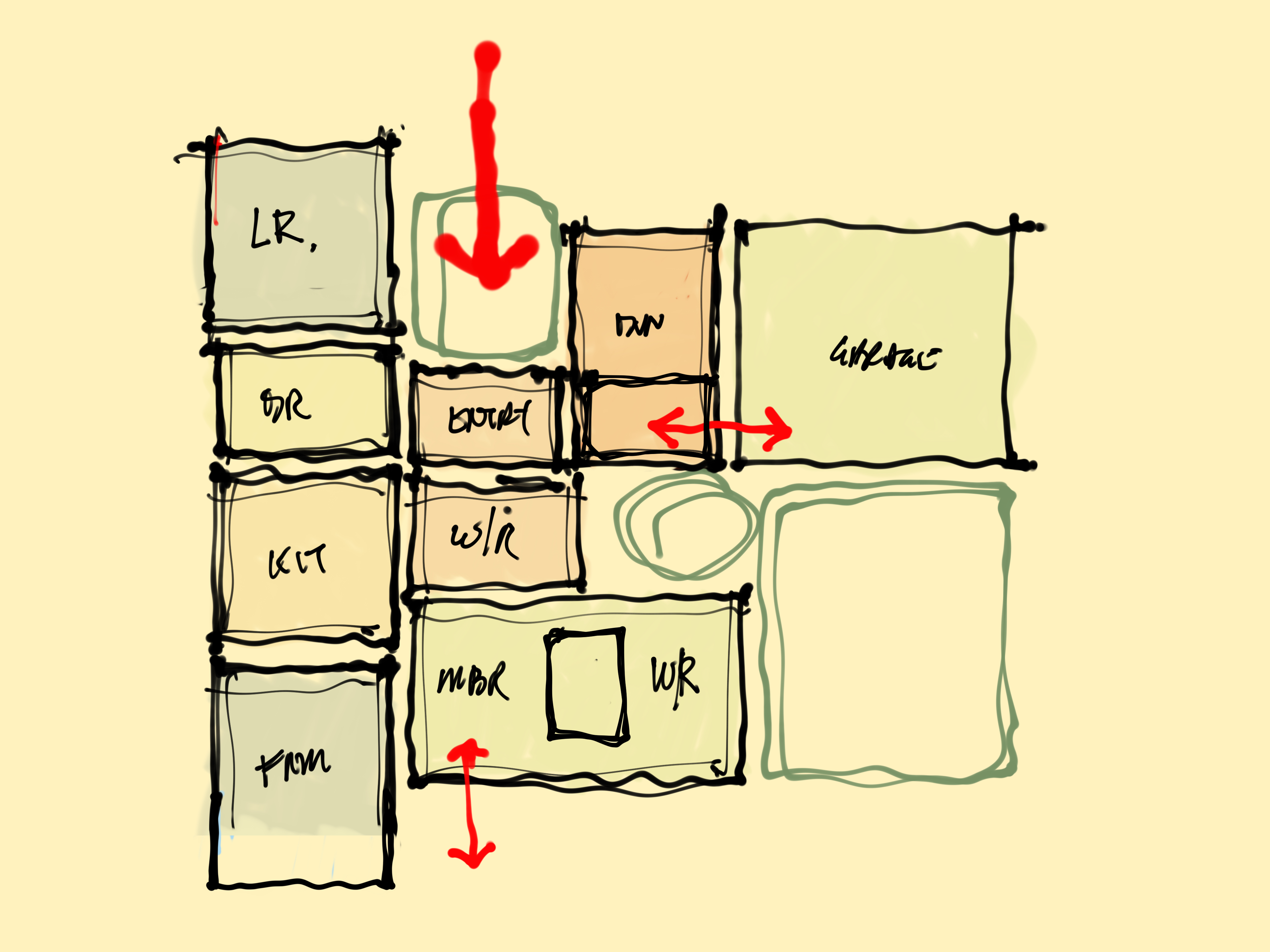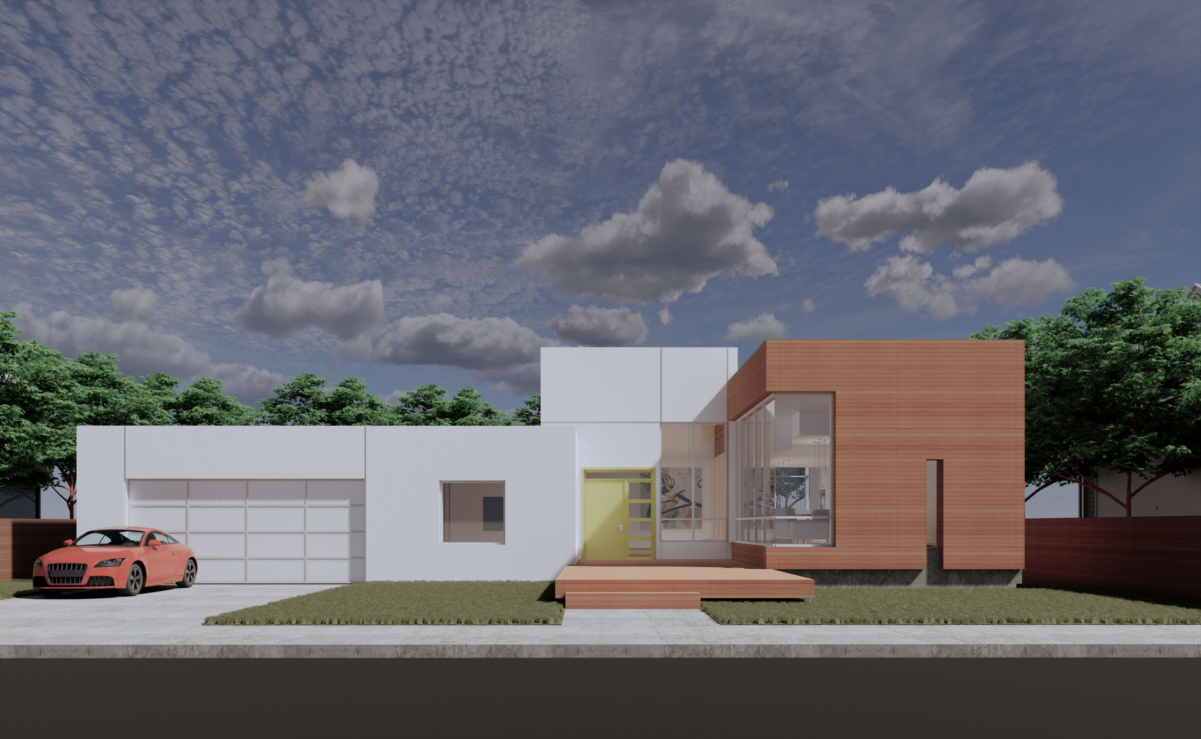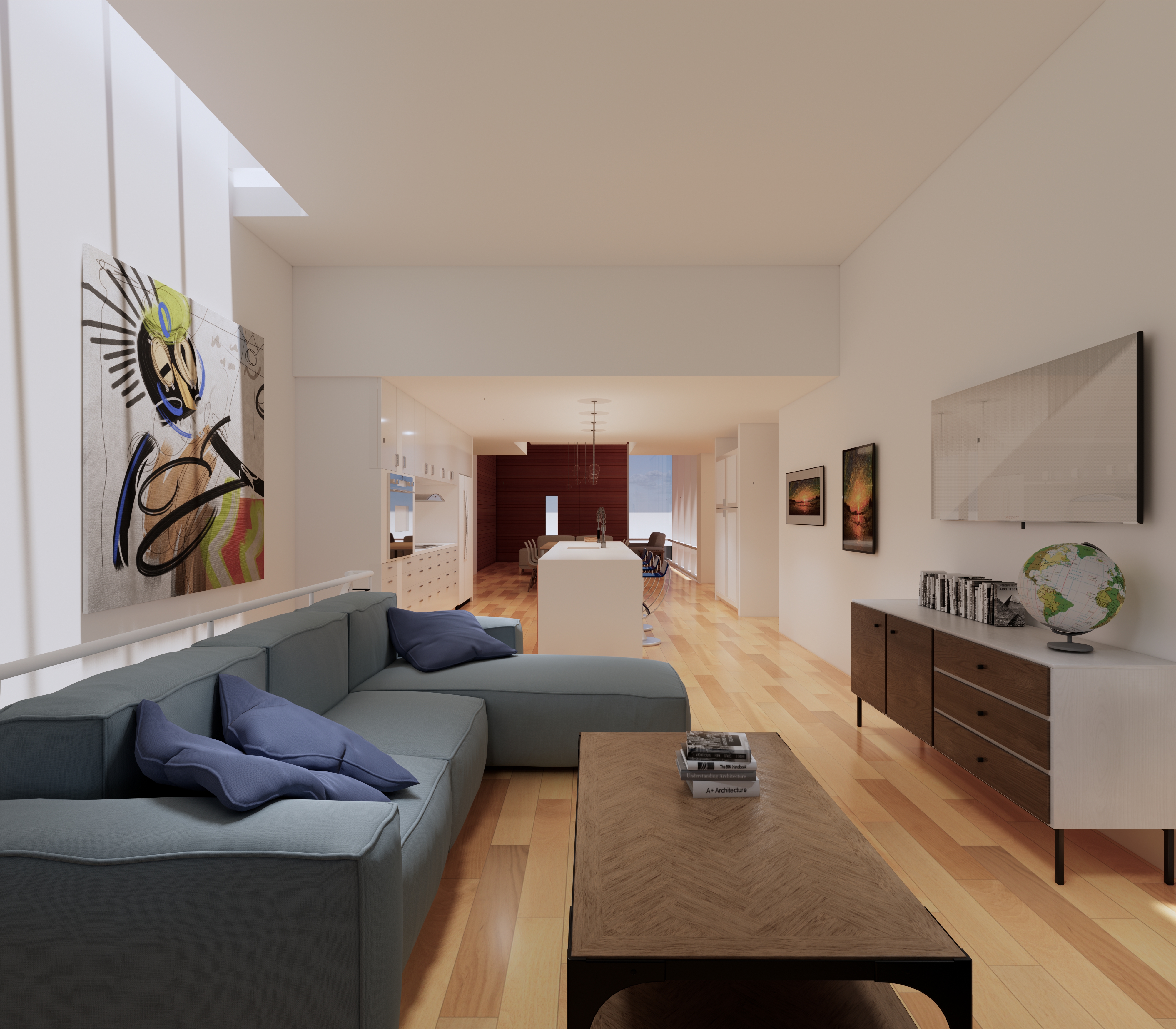 Natural light is carefully orchestrated throughout: glazing provides openness while preserving wall surfaces for art, and a skylight above the stair brings grazing light down the family area wall to the basement. The material palette is warm and restrained, with wood planks paired against smooth stucco. At the entry, an enlarged deck doubles as a welcoming threshold and a flexible garden space for potted plants, fulfilling the owners’ wish for a planted forecourt.