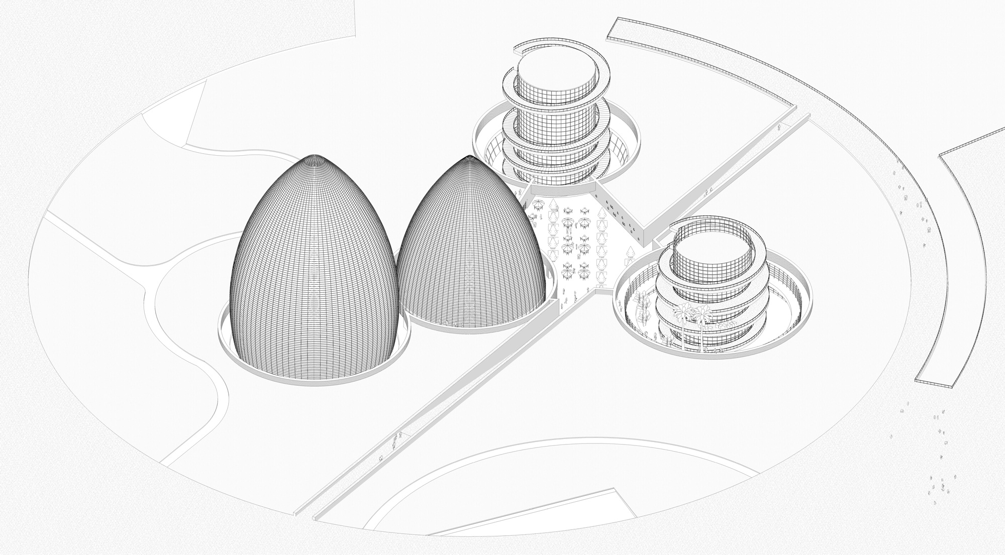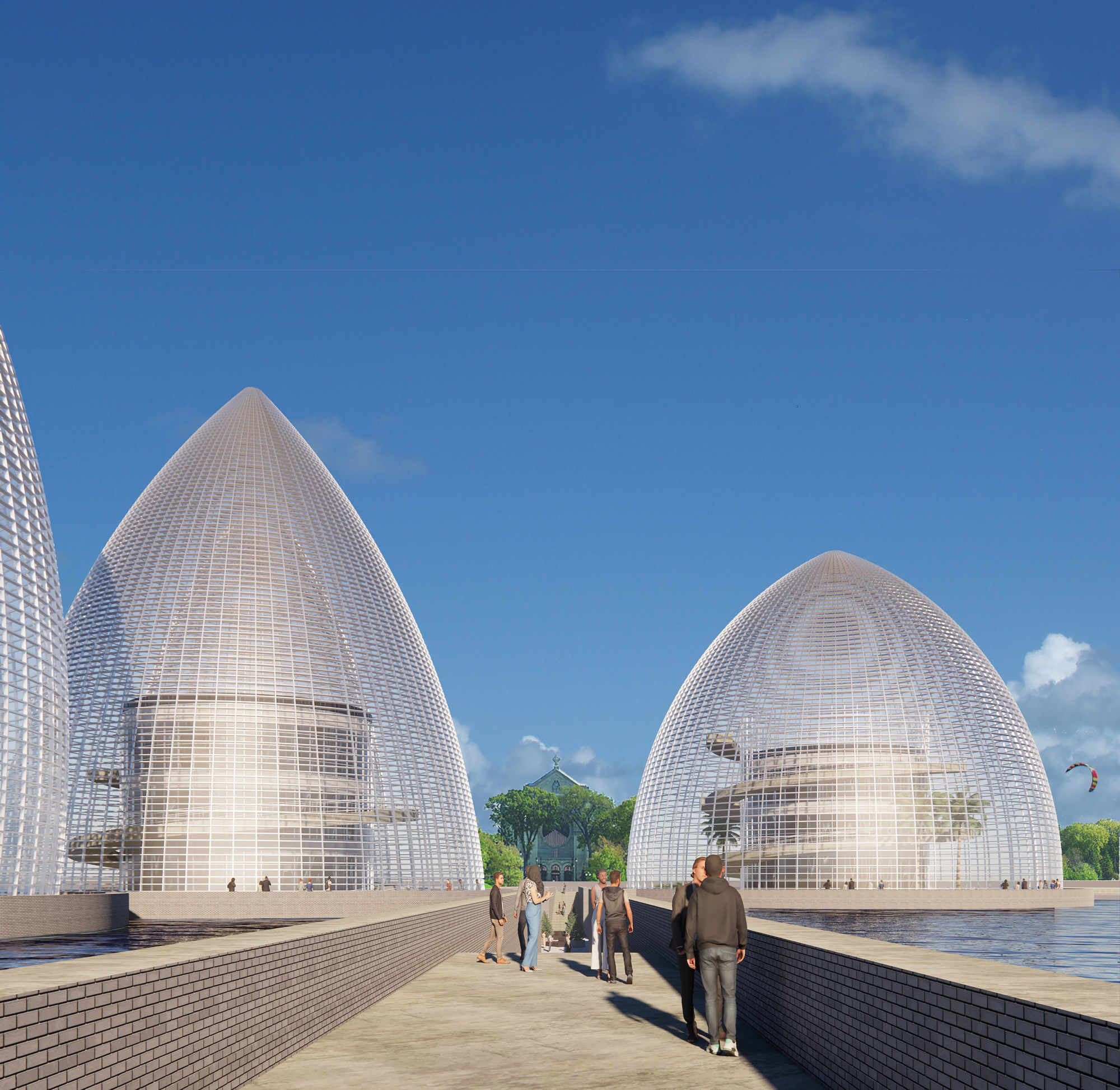 The four whaleheads rise from the water as monumental figures, each uniquely shaped yet unified as a family of forms. Between them, a central public plaza provides space for gathering, dining, and rest—an extension of the city’s civic life woven into the architecture.