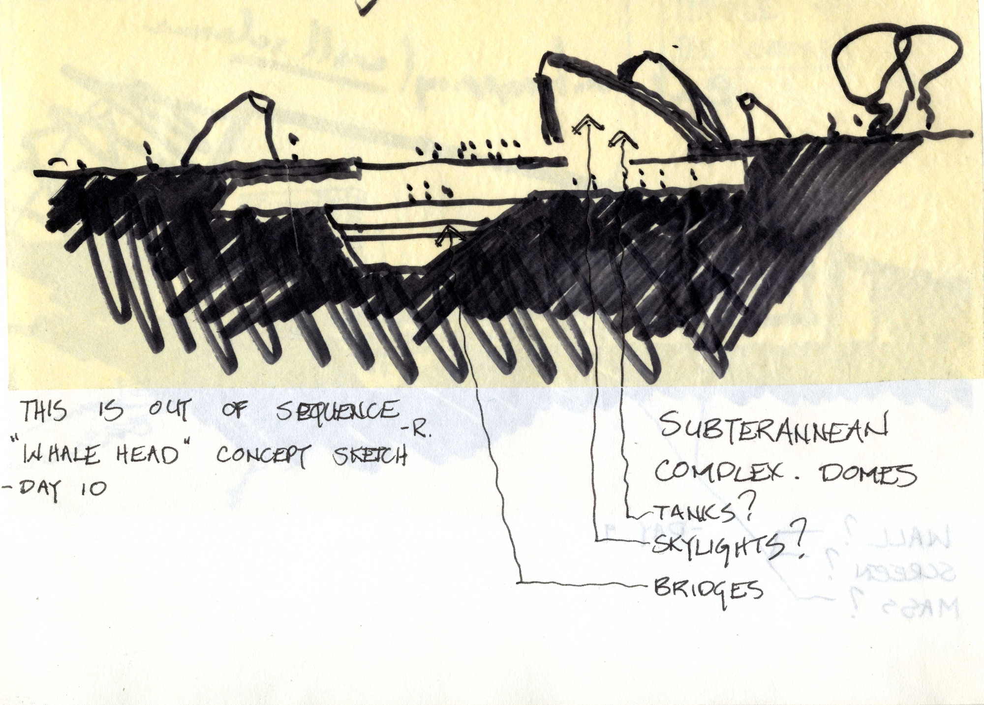 - Above Grade: Four large marine tanks, enclosed within sculptural “whalehead” forms. These curved, iconic volumes contain distinct exhibits accessed via ramped circulation. Their upper levels open into outdoor tanks and terrariums for marine mammals.