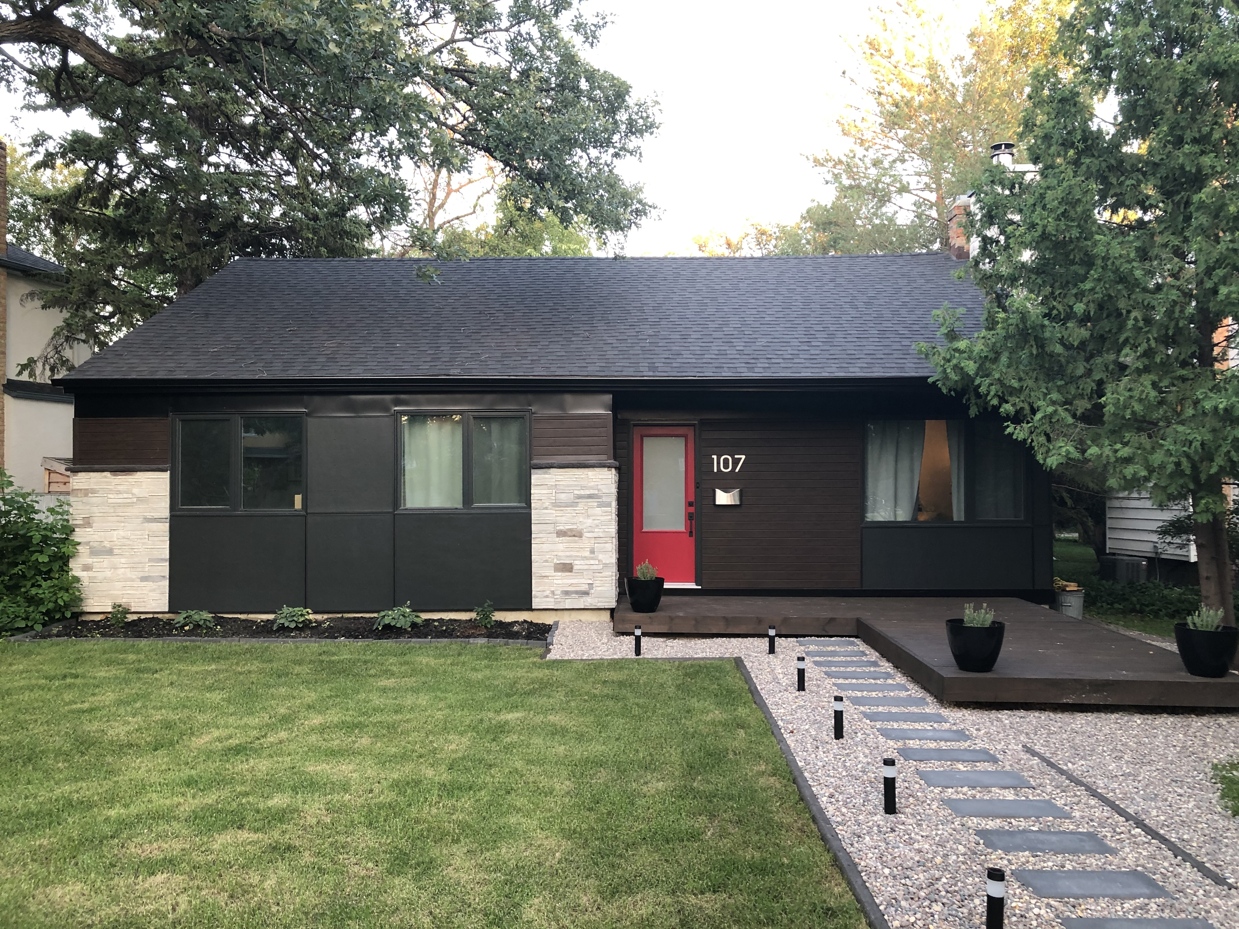 This project updated the exterior of a 1950’s bungalow in Old Tuxedo to be more contemporary, energy efficient and accessible. The entire exterior including existing stucco, concrete step, windows, fascia and eavestrough were replaced with new insulation, fiberglass windows, cladding and deck. The cement board panels, siding and cultured stone façade creates a modern and welcoming approach to the front of the house.