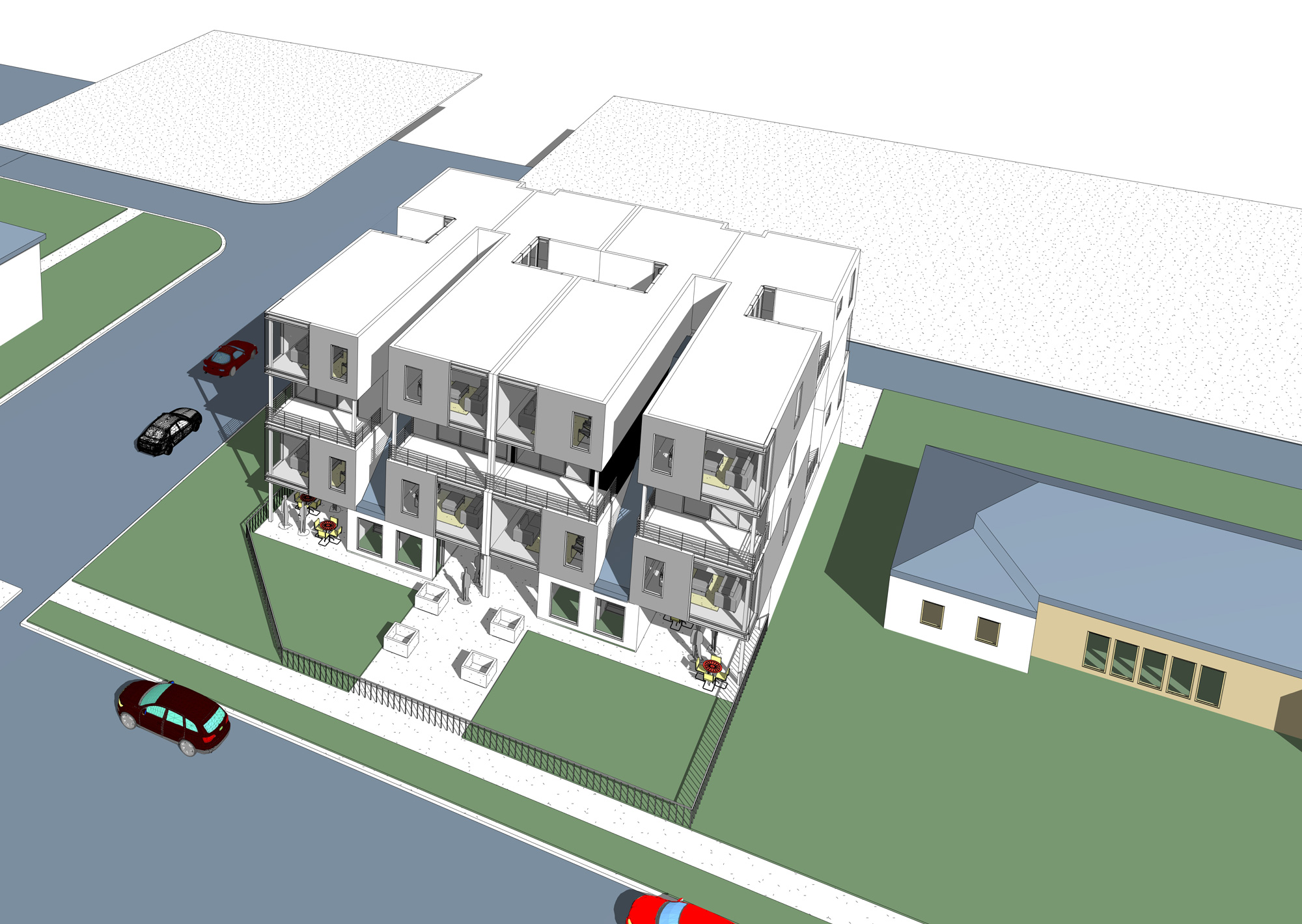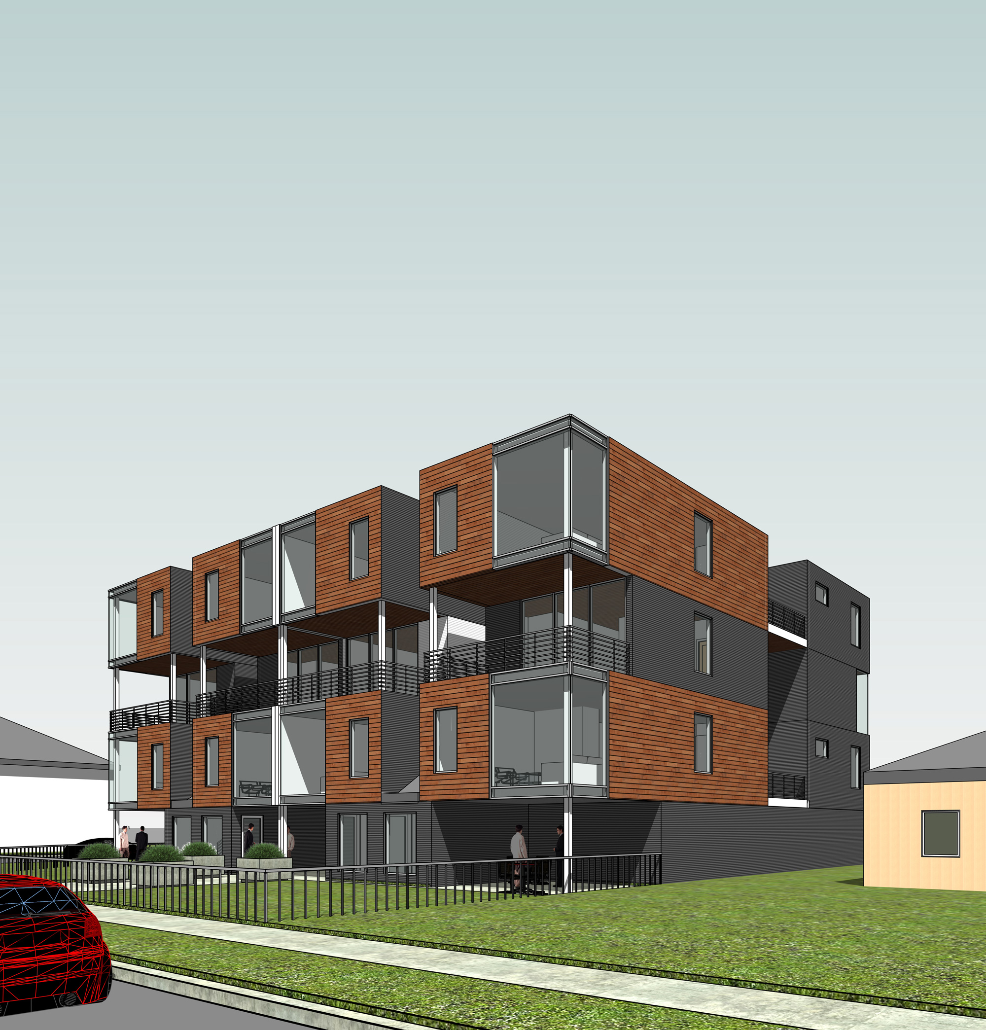 The complex was designed similar to the 505 Academy Road condos in that it was designed as two separate buildings so the development could be phased. The project contains 8 large 2-bedroom units with the primary bedroom on its own level. Each level has space carved out in the middle that serves either as a patio or light well. This provides natural views and light into the units and breaks up the massing of the building to make it more comfortable in the residential The units are stacked in a way that provides for covered balconies.