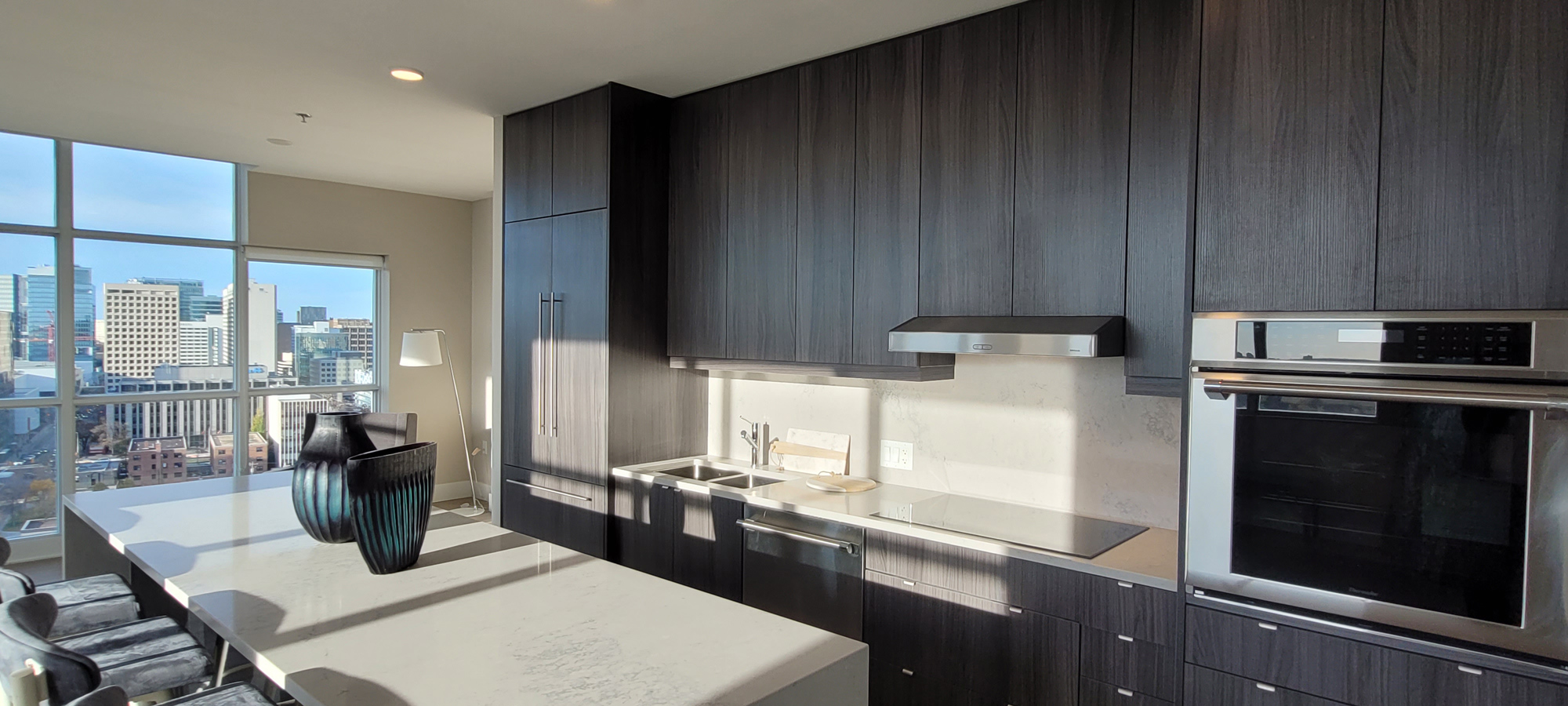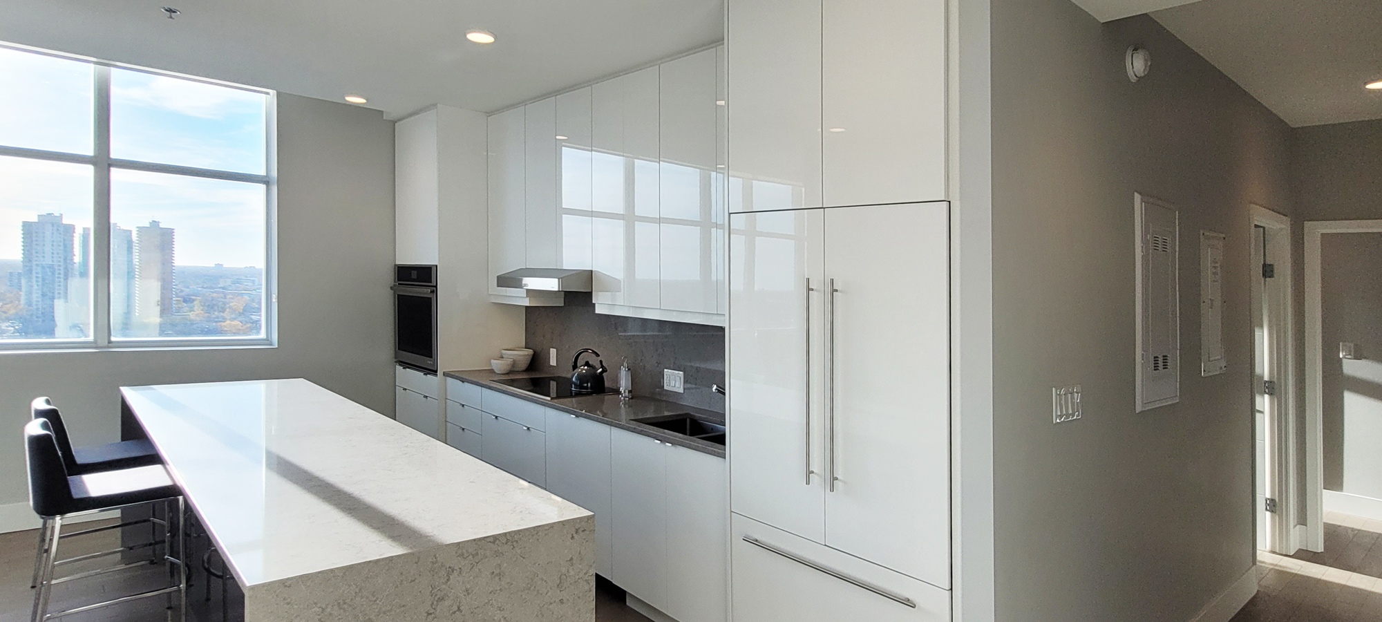 The podium and tower structure is cast in place concrete with heated floors and embedded electrical infrastructure. Each residential floor contains between 4 and 6 units. Interiors are modern with Italian kitchens and sleek finishes. The larger units are located on floors 15-23 with penthouse units on the top floor.