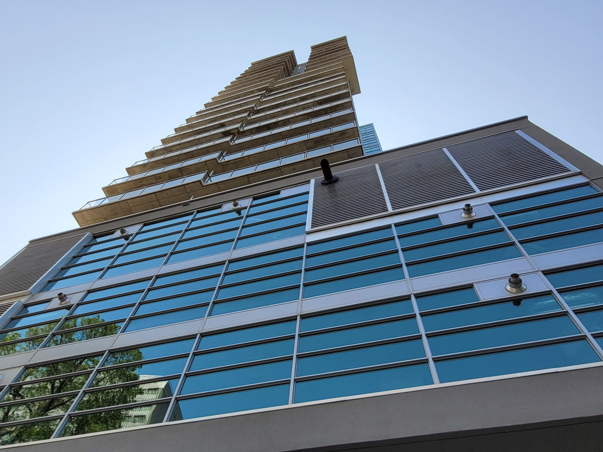 The Exterior envelope is entirely composed of window wall with insulated metal panel running vertically along the elevator core.