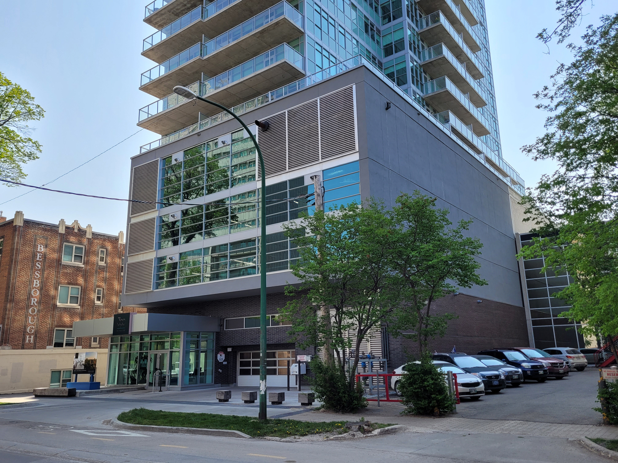 The parking podium has full height glazing on the north and south walls and contains parking stalls, a car wash, and visitor parking.