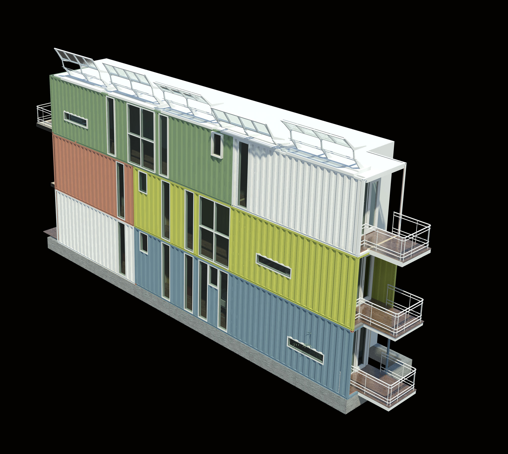 The study examined both the possibilities and constraints of employing shipping containers as housing units. Each level was conceived from one 40-foot and one 20-foot high-cube container, allowing the units to be stacked up to three storeys. Within this framework, the program could accommodate a compact kitchen and dining area, living space, as many as four bedrooms, and between three and five bathrooms.