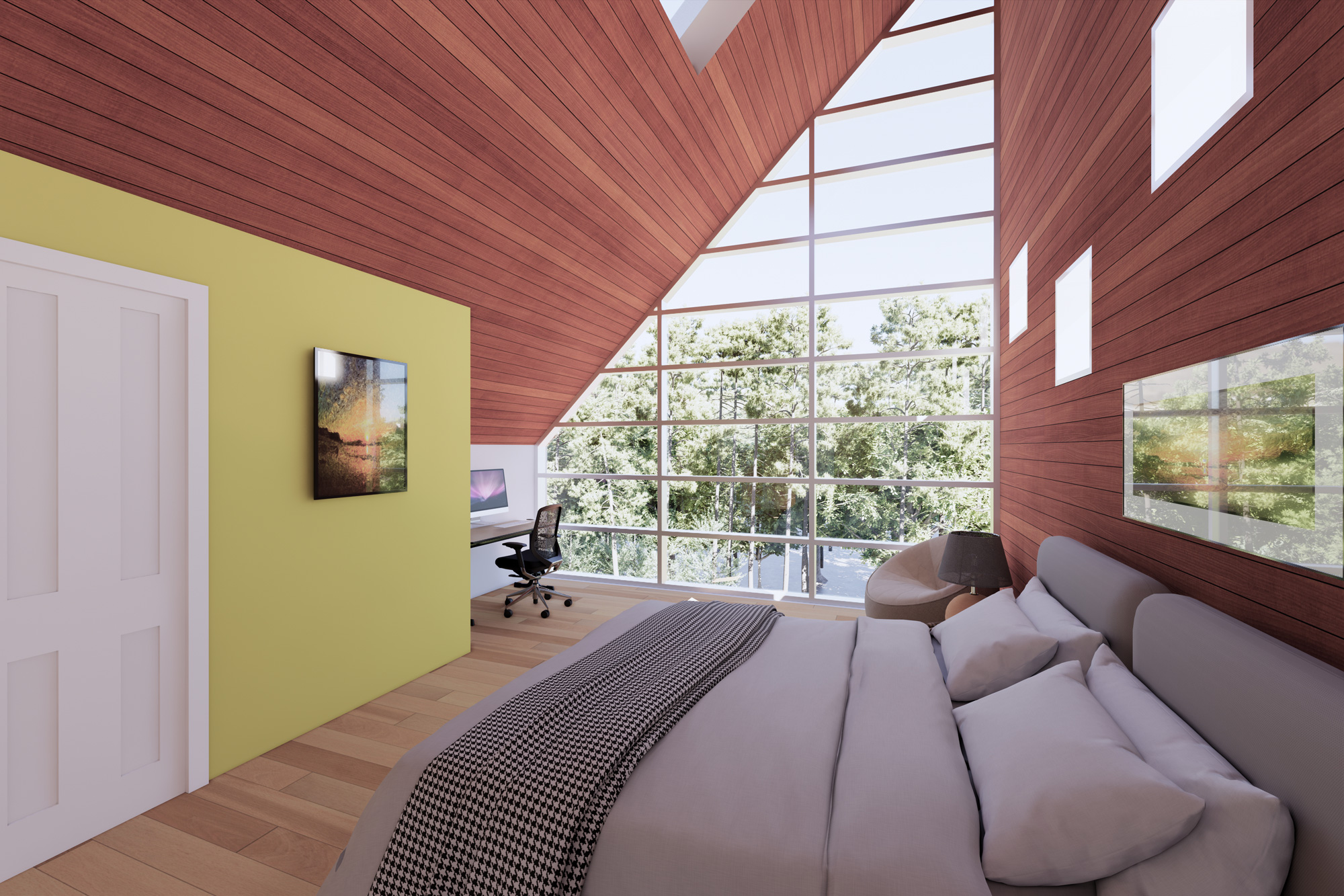 The roof is conceived as a defining element. Its geometry is both functional and symbolic—shedding water and snow while shaping interior space through light and shadow.