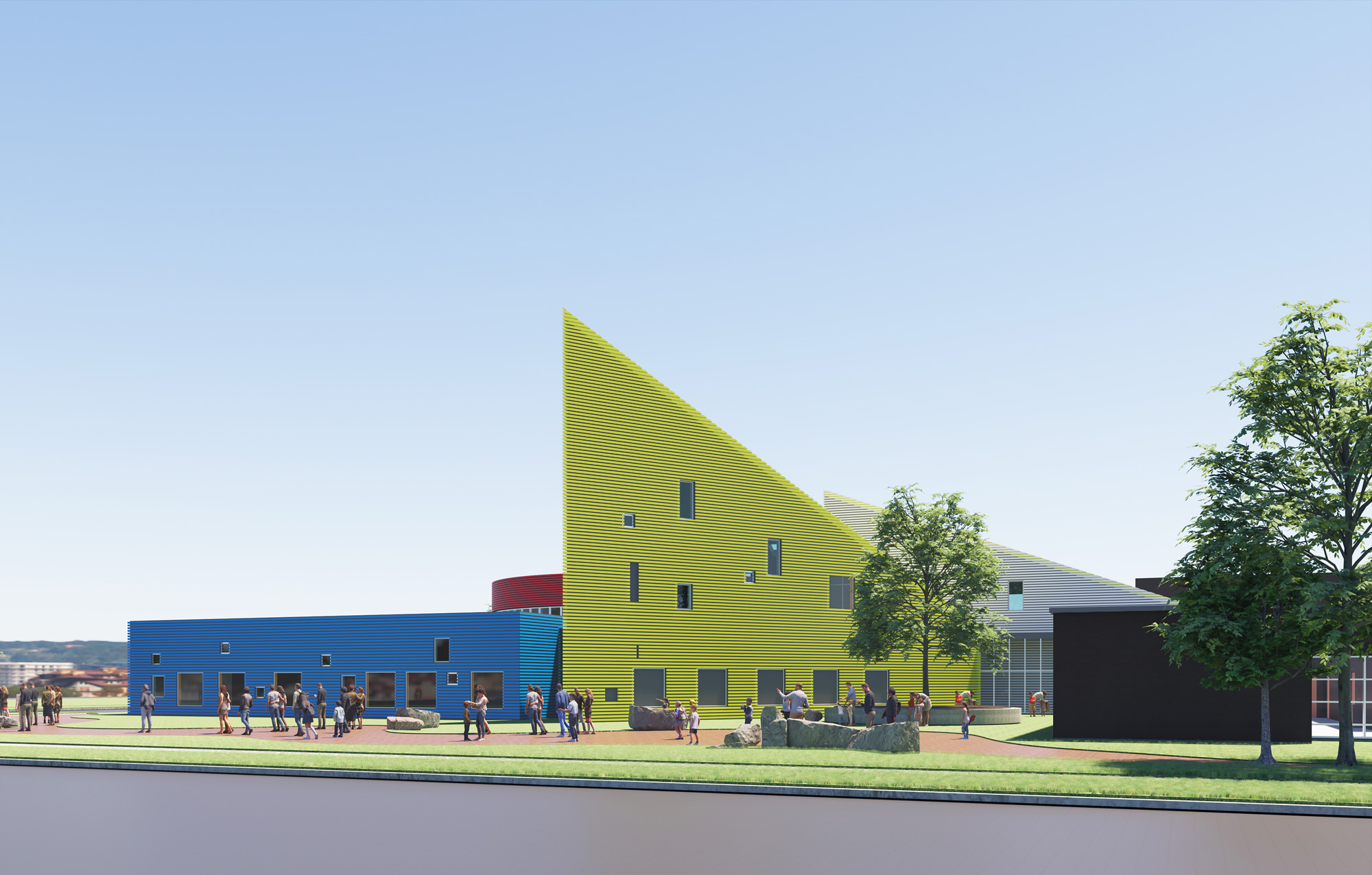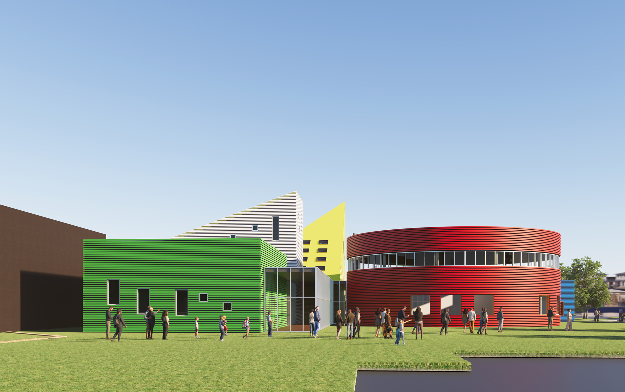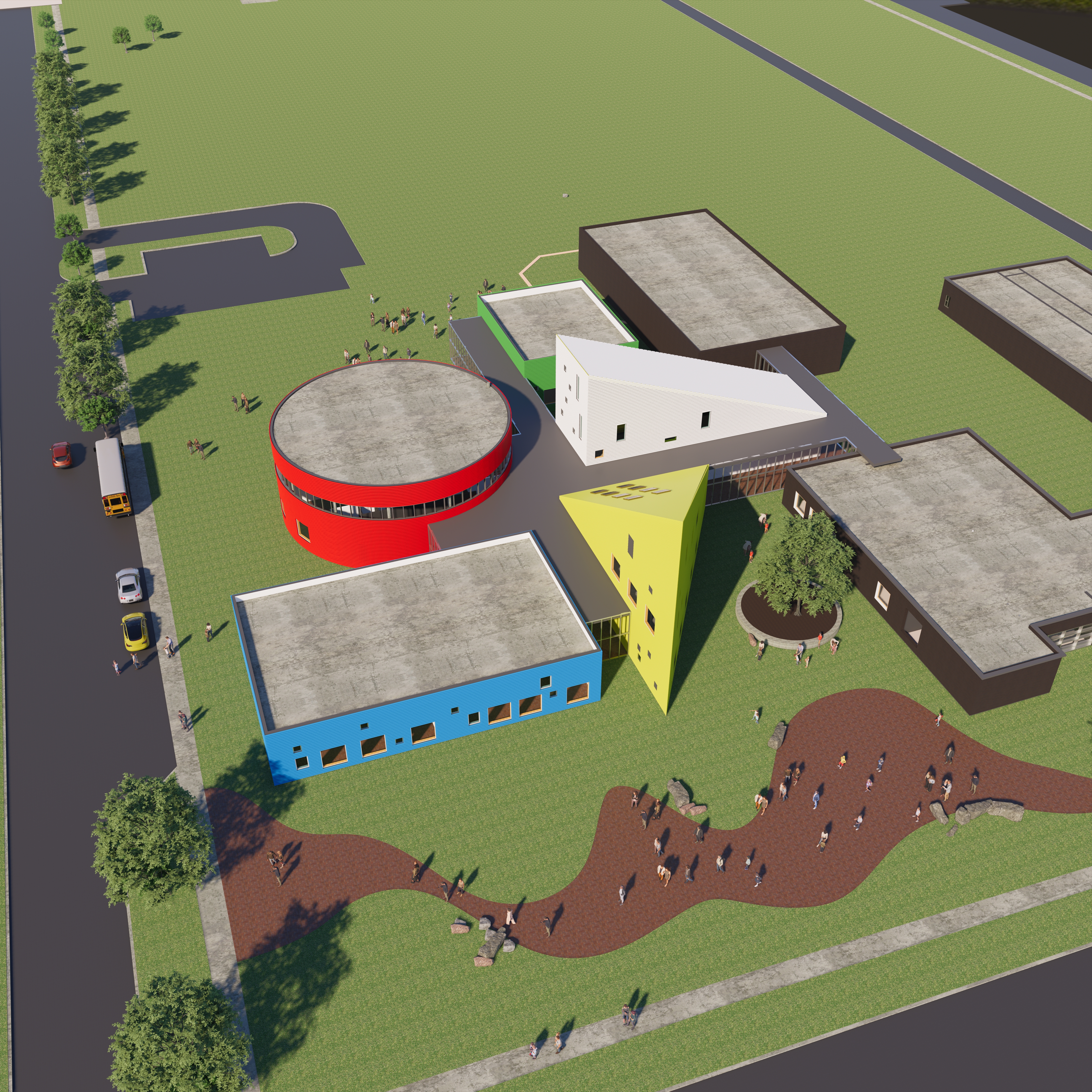 The program included five classrooms, an art room, a science room, offices, spaces for health and life skills, a gymnasium, and areas for outdoor study and collaboration. Each program element was given a distinct identity, expressed through form and colour. Primary geometric volumes—a blue cube, a red cylinder, a yellow prism—acted as legible icons, orienting students and reinforcing the idea that the building itself participates in teaching.