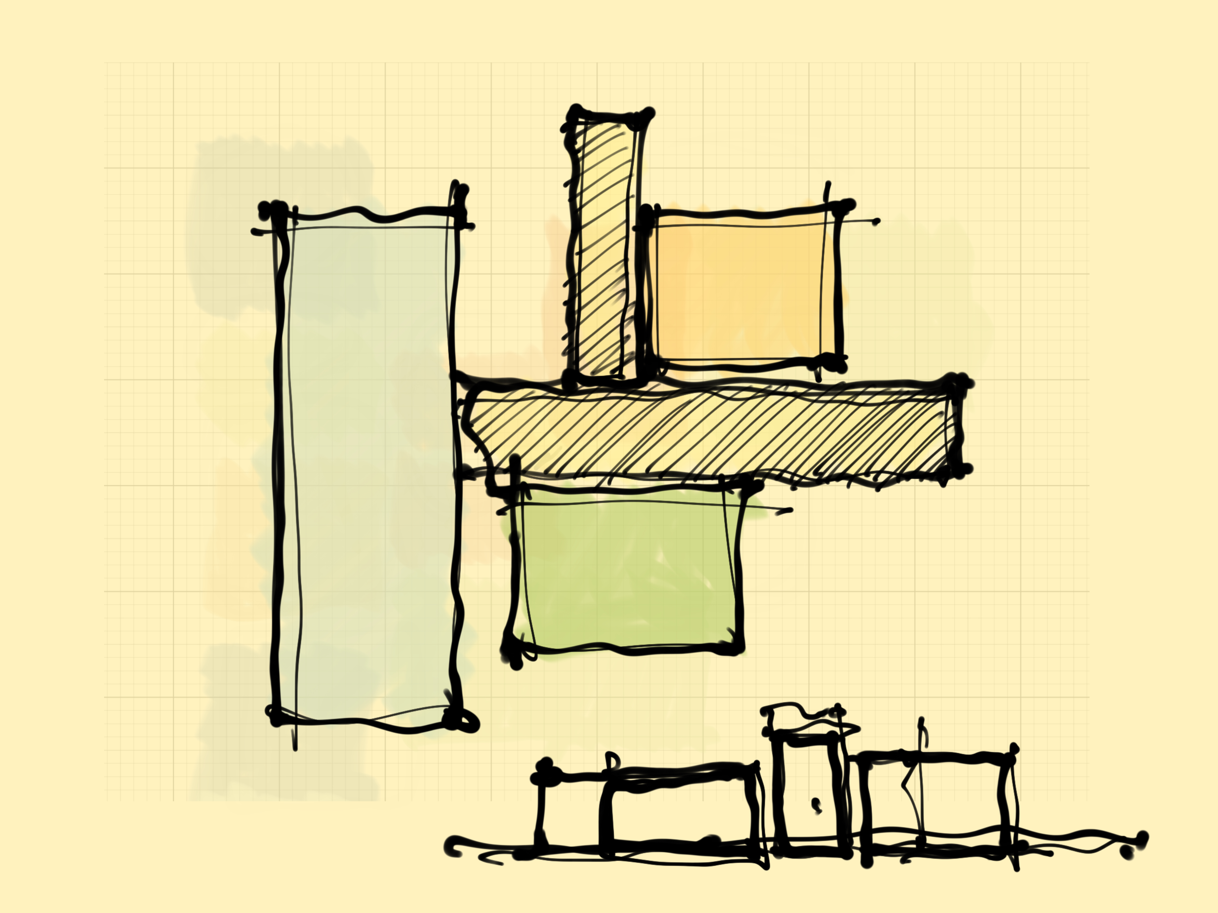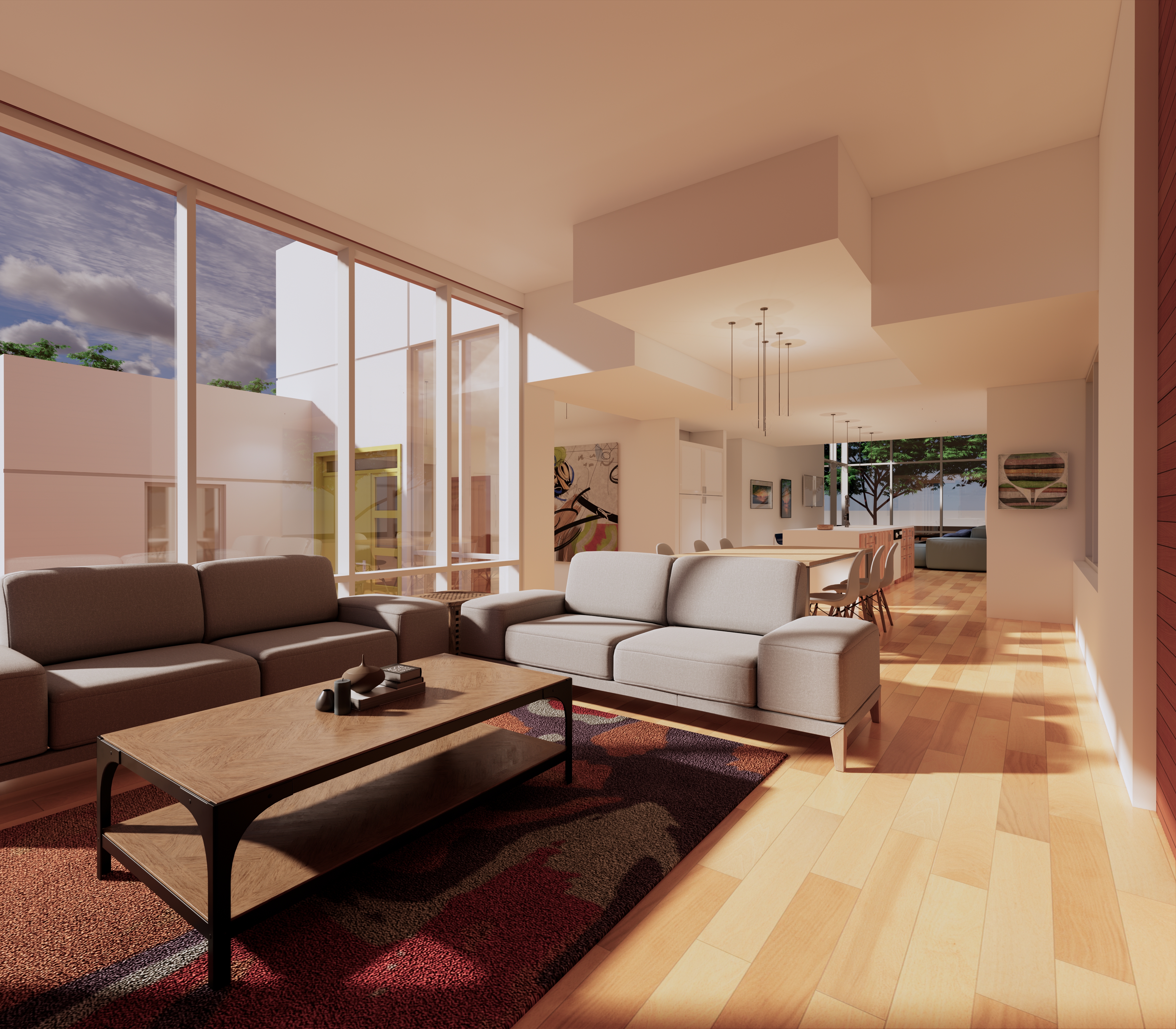 Natural light is carefully orchestrated throughout: glazing provides openness while preserving wall surfaces for art, and a skylight above the stair brings grazing light down the family area wall to the basement. The material palette is warm and restrained, with wood planks paired against smooth stucco. At the entry, an enlarged deck doubles as a welcoming threshold and a flexible garden space for potted plants, fulfilling the owners’ wish for a planted forecourt.