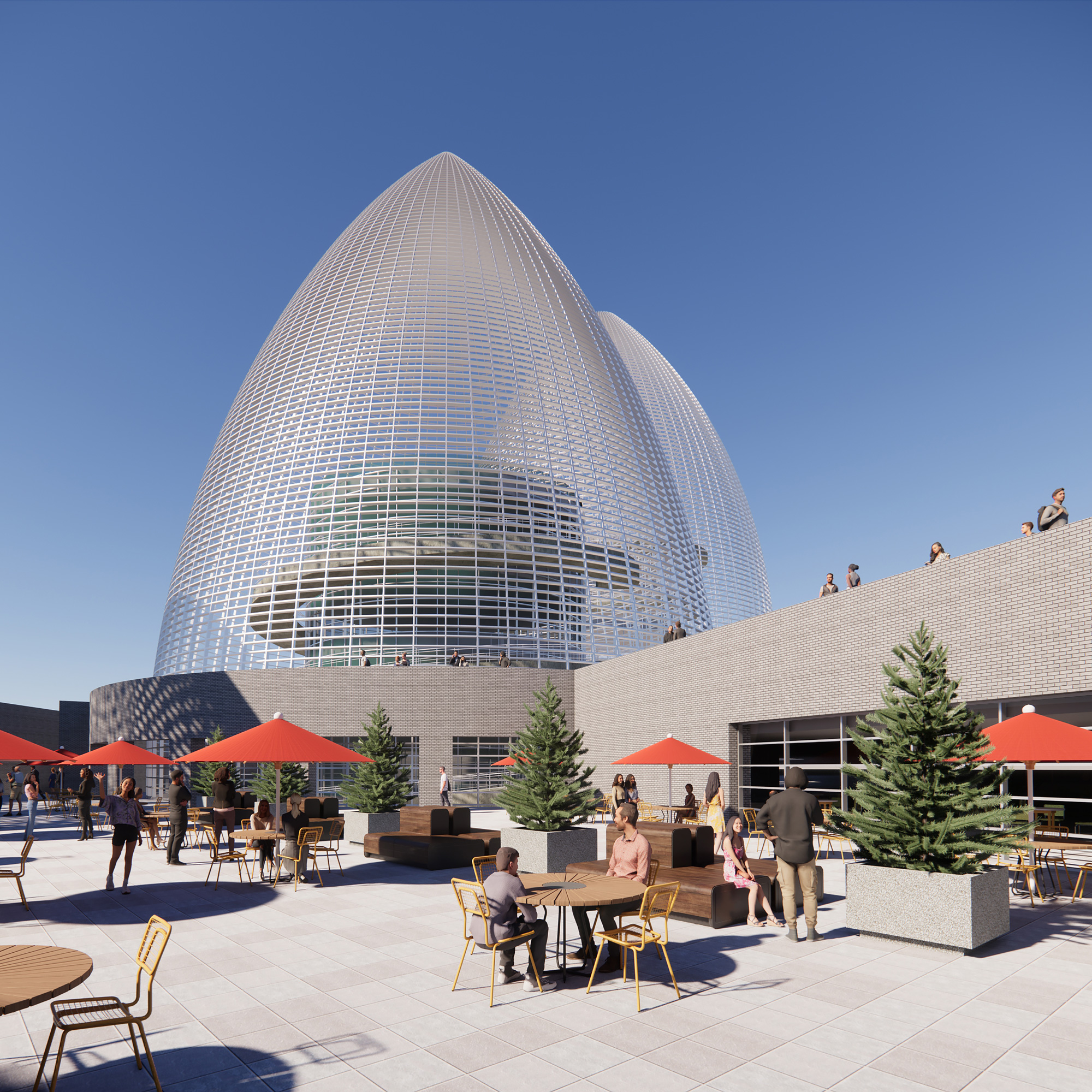 - Above Grade: Four large marine tanks, enclosed within sculptural “whalehead” forms. These curved, iconic volumes contain distinct exhibits accessed via ramped circulation. Their upper levels open into outdoor tanks and terrariums for marine mammals.
