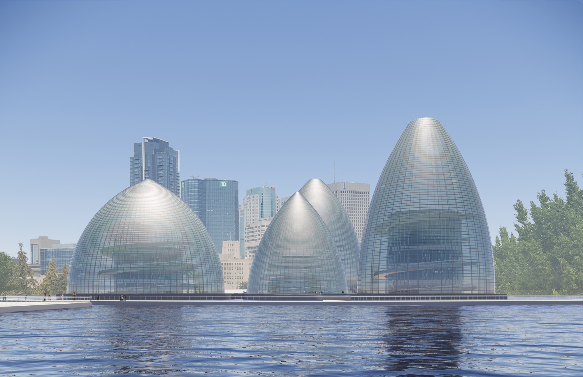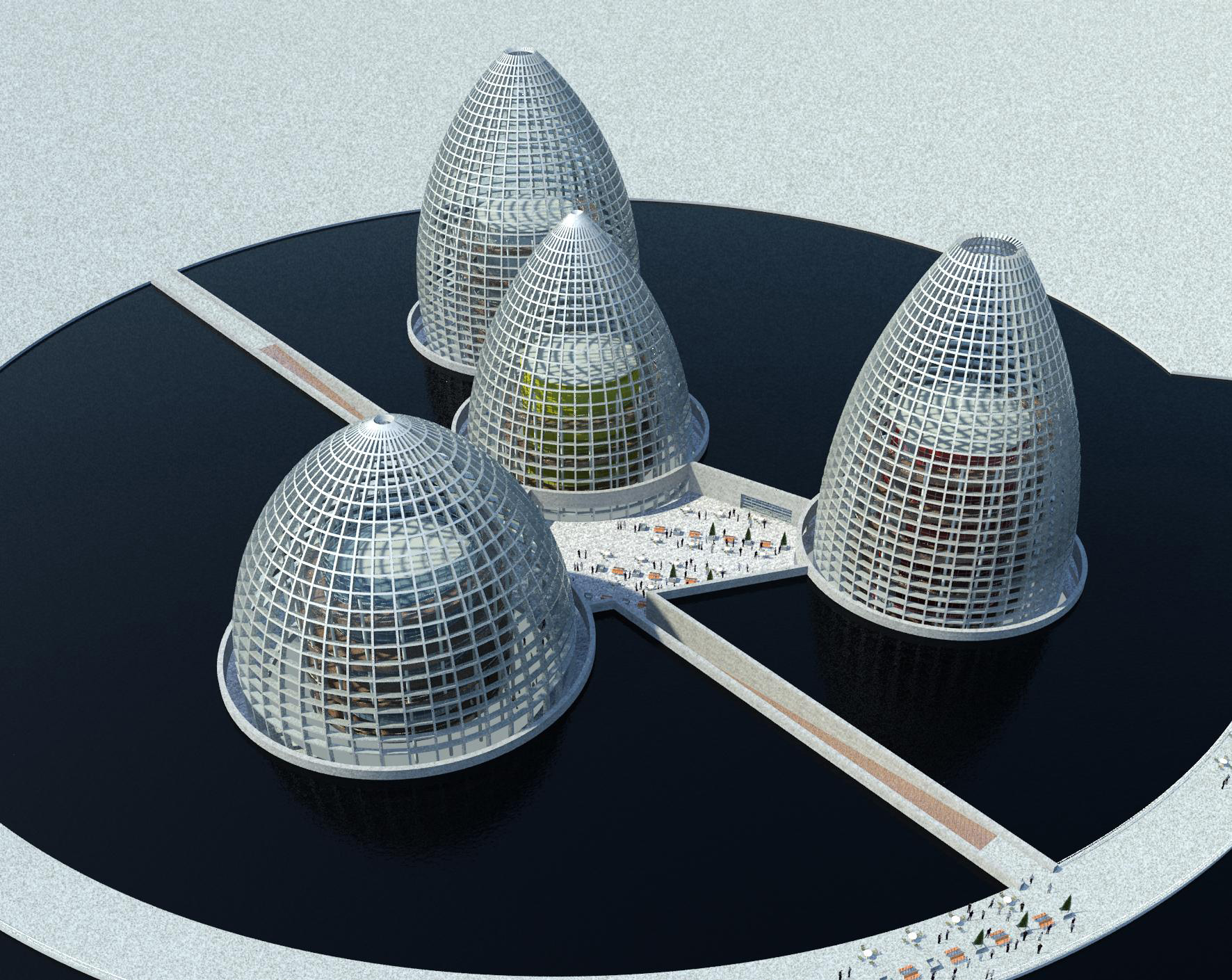 The four whaleheads rise from the water as monumental figures, each uniquely shaped yet unified as a family of forms. Between them, a central public plaza provides space for gathering, dining, and rest—an extension of the city’s civic life woven into the architecture.